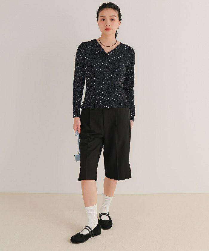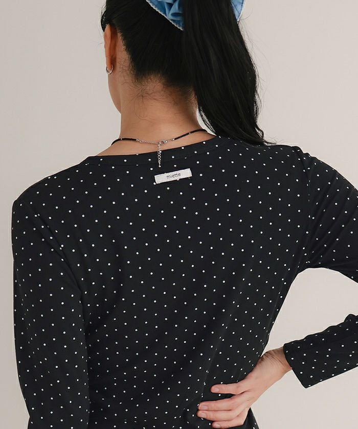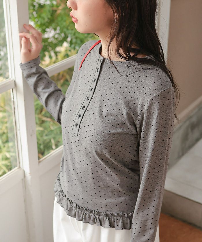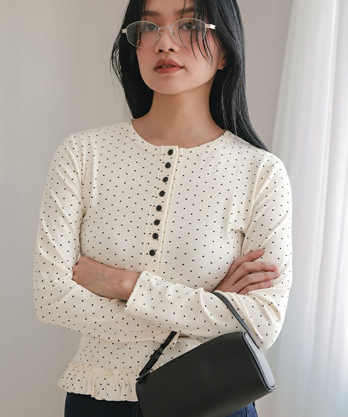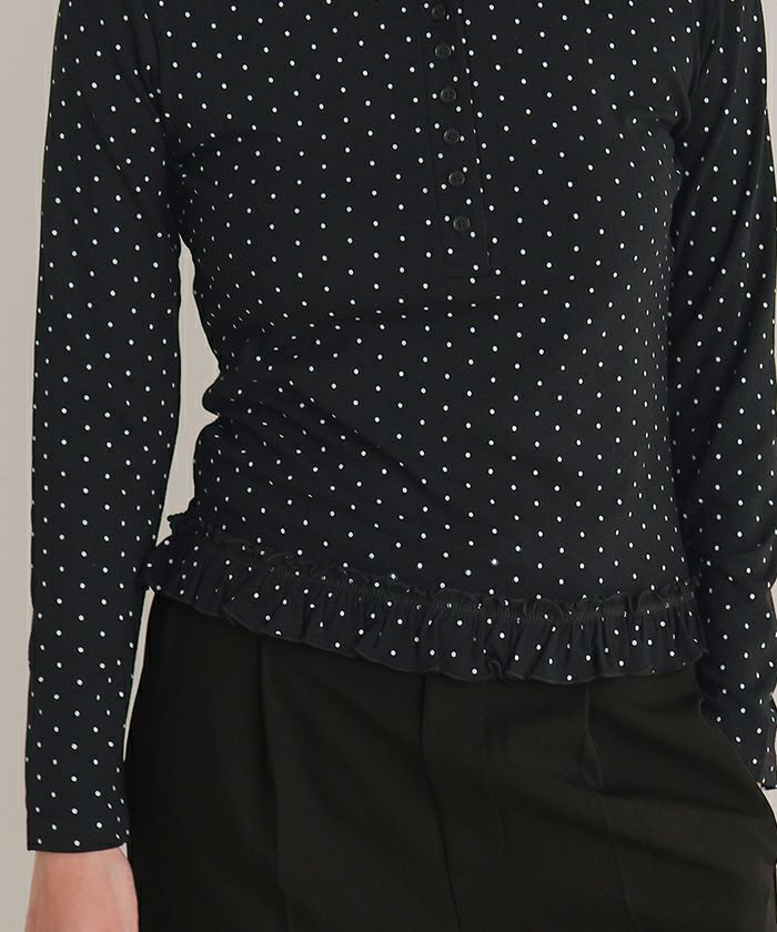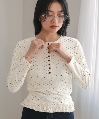 ・ドット柄生地のヘンリーネックと裾フリルがトレンドデザインで1着で決まるトップス