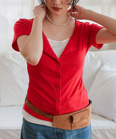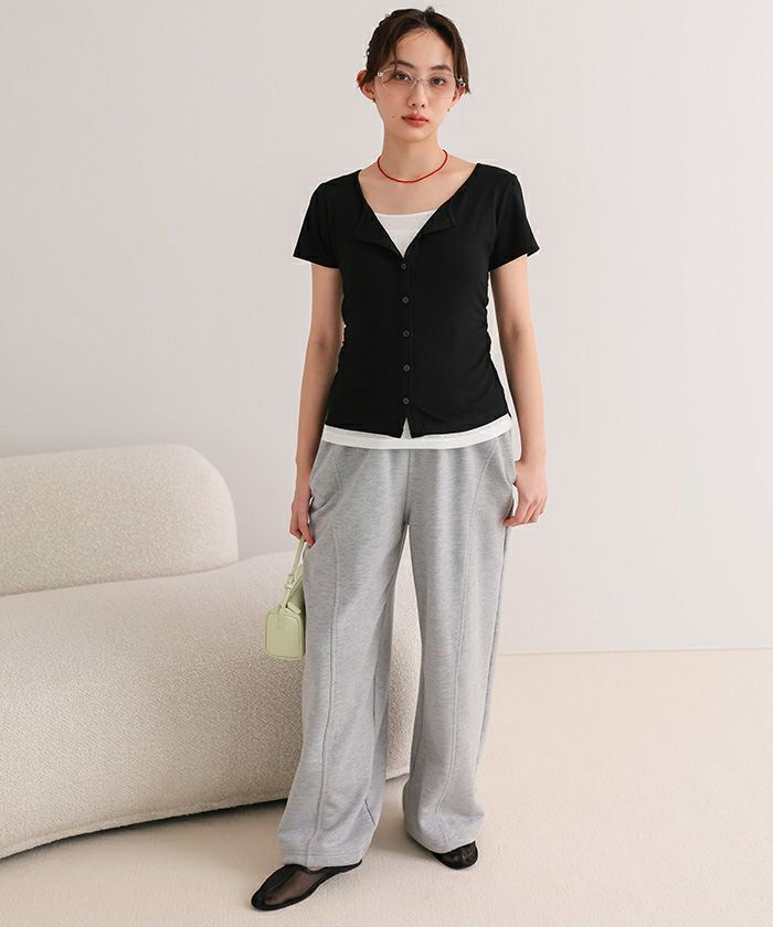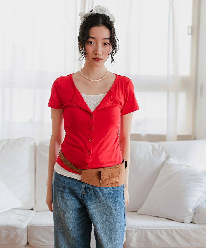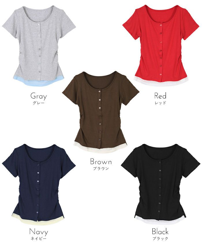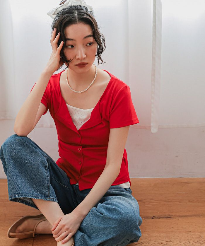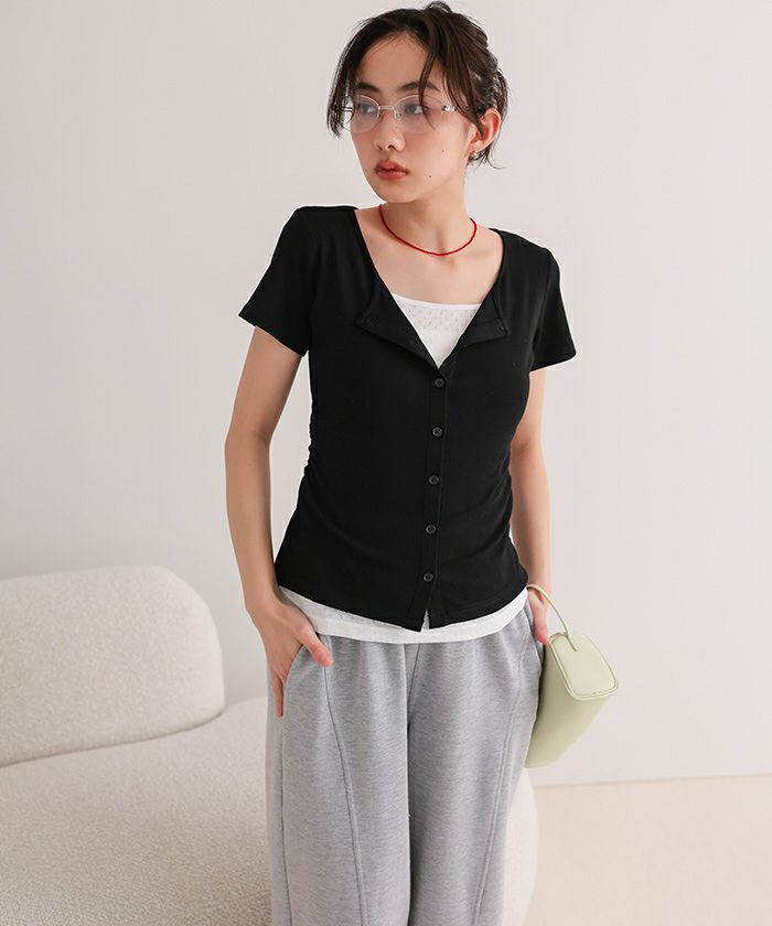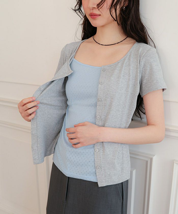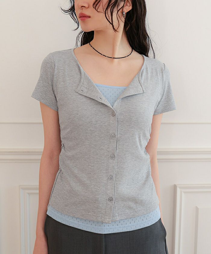 ・アイレットジャガード素材のトップスを重ね着したような、レイヤード風デザインの半袖トップス