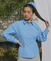 ・同素材のシュシュが付いたすっきり見えるパネルライン仕立てブラウス