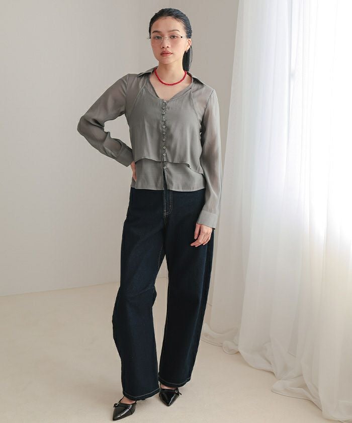 ・透け感のある生地なので活かしたレイヤードスタイルも◎
