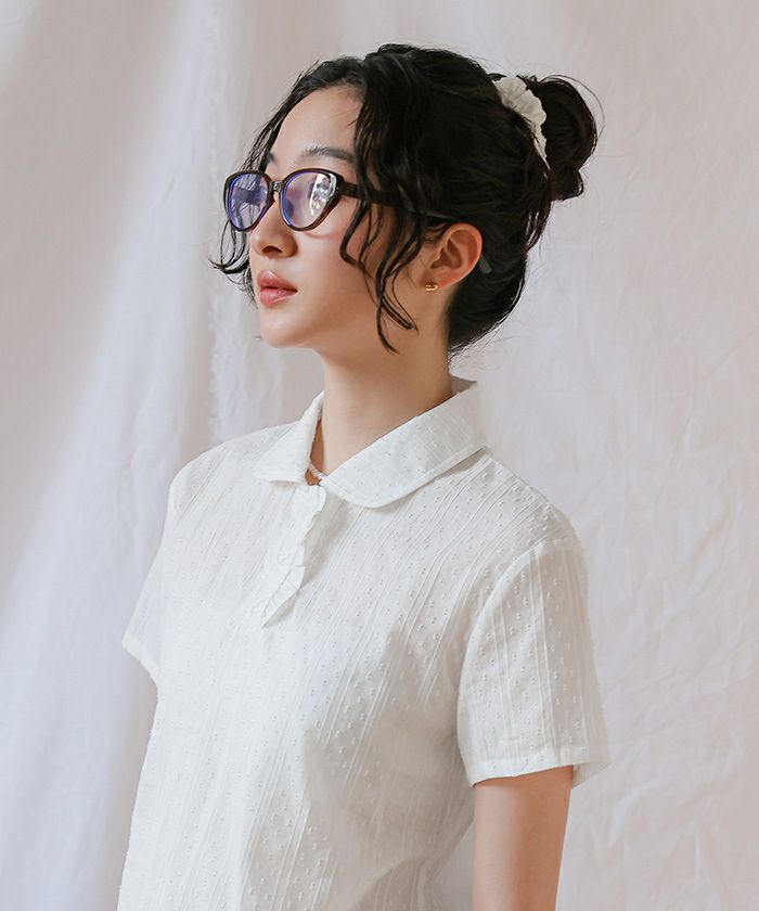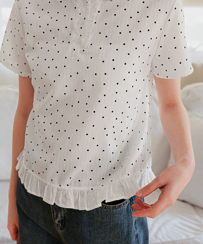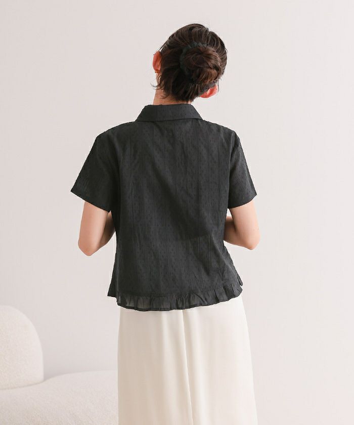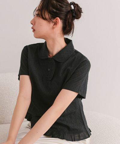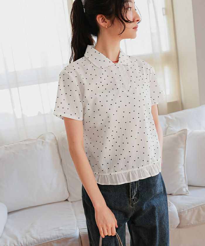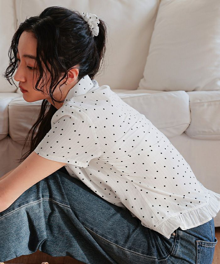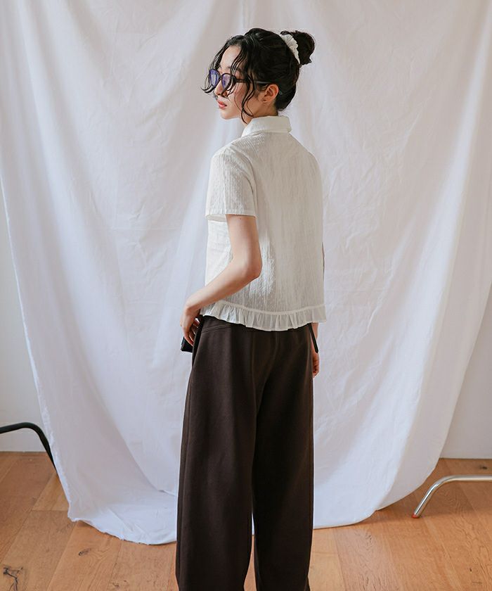 ・丸襟デザインと裾フリルが目を惹く、シュシュ付きブラウス