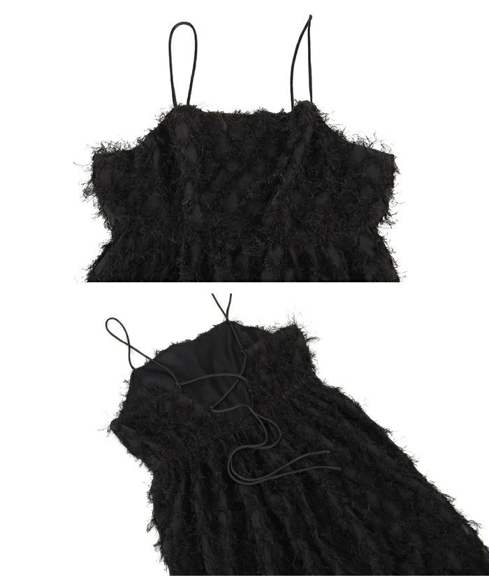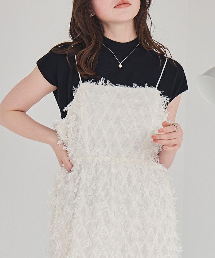 ・トレンド感のあるフリンジ素材が魅力のキャミソールワンピース。