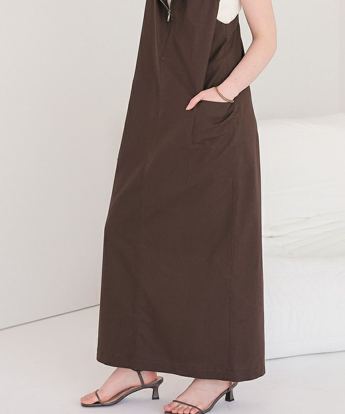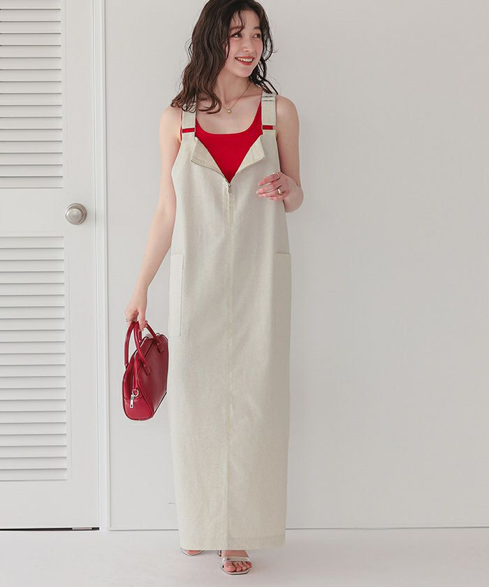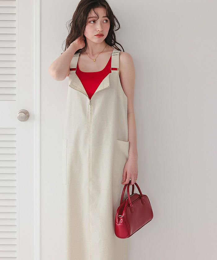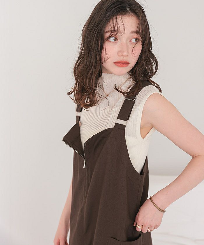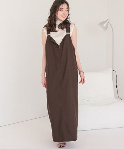 ・フロントをジップで開け閉めできる、デザインジャンパースカート。ジップを開けて垂らして着ても、閉めて着ても◎着こなしを気分で楽しんでいただけます。
