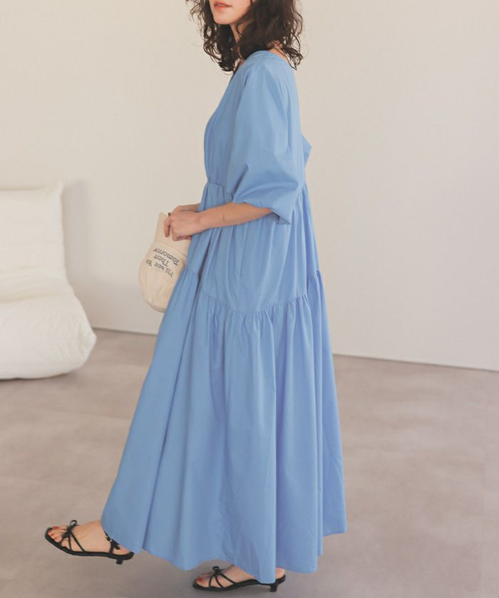・ウエストにギャザー切り替えをいれ、ボリューム・シルエットにメリハリが出るように設定したロングワンピース。