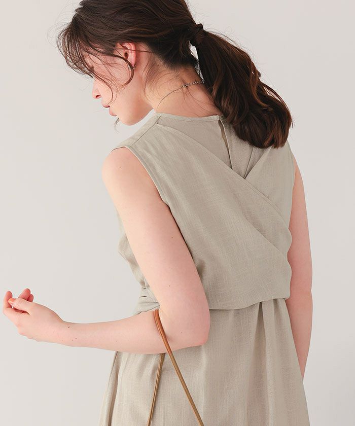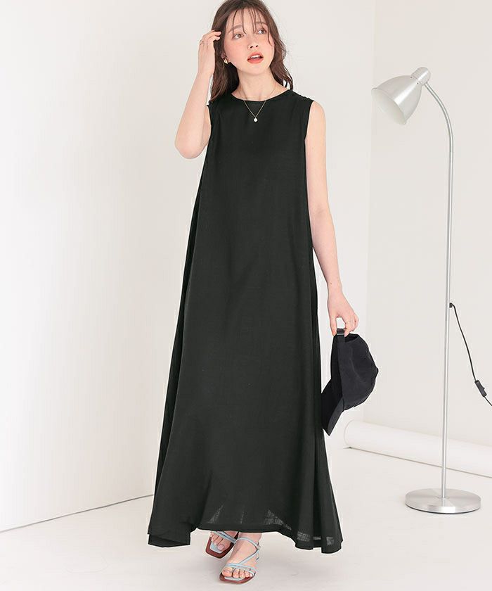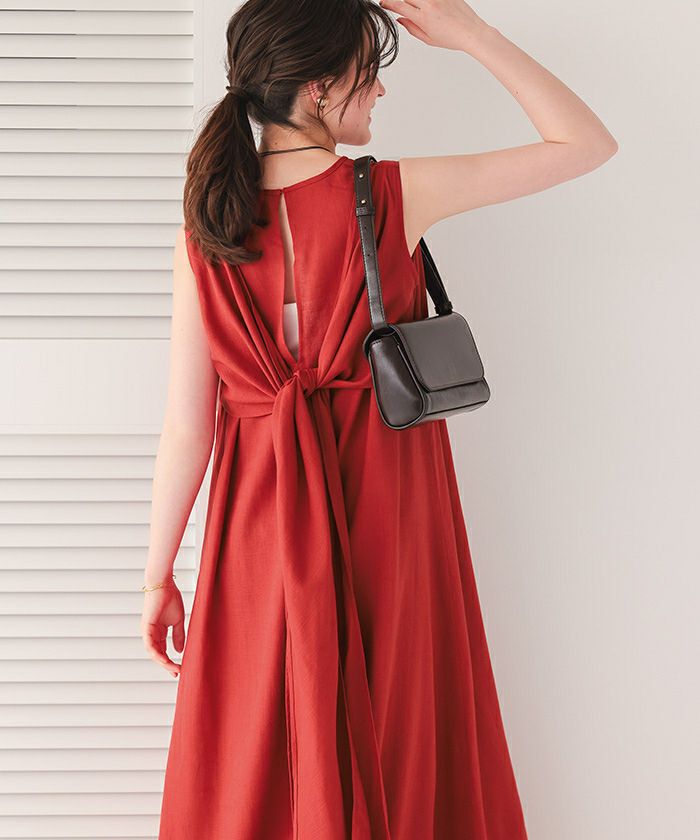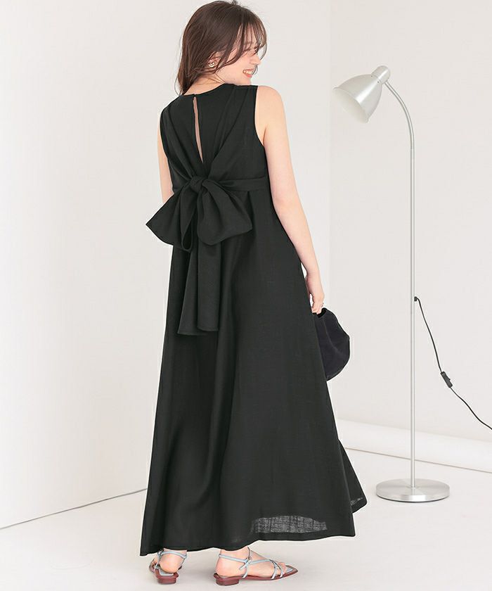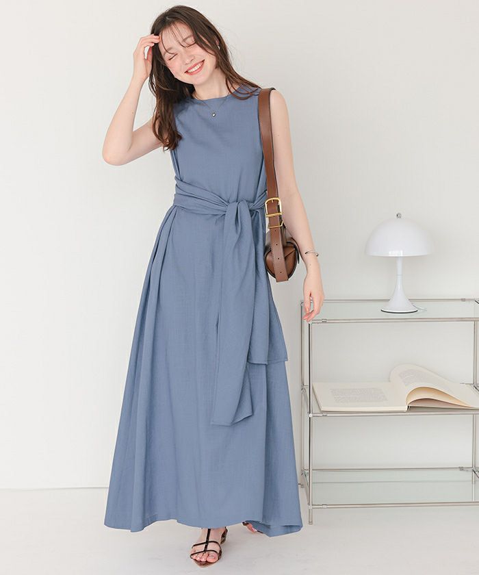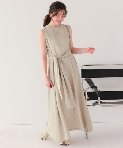 リネン混素材で涼しげな印象をプラスするリボンマキシワンピース。
