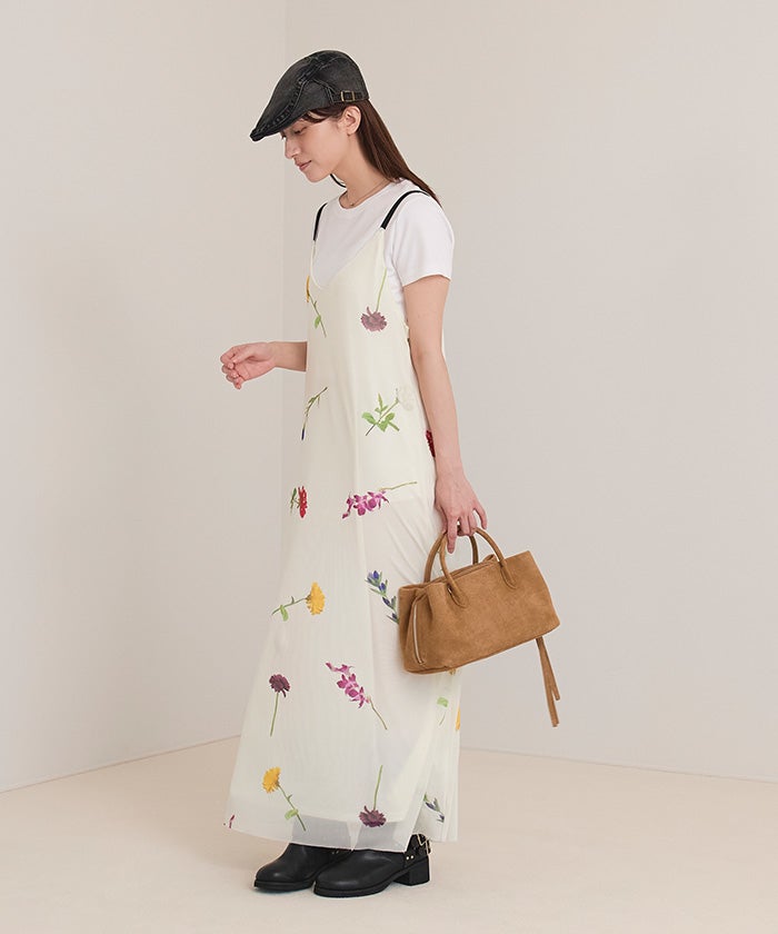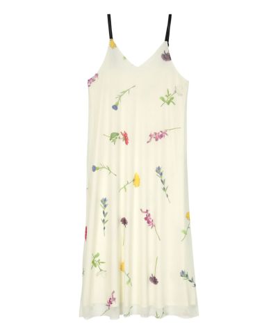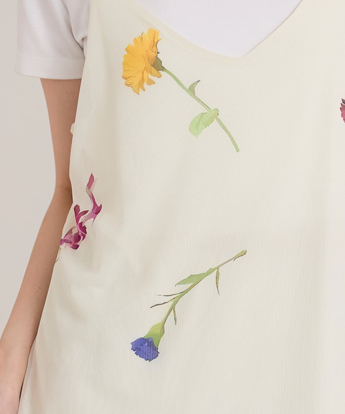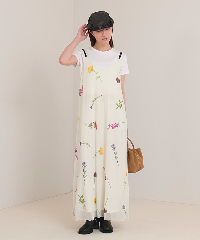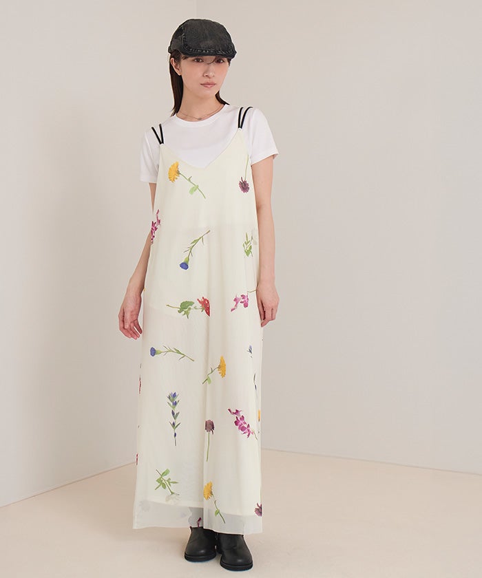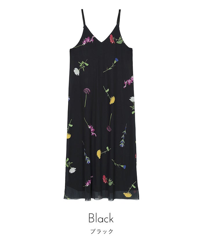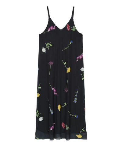・大柄のプリントチュール素材で存在感のあるキャミソールワンピース