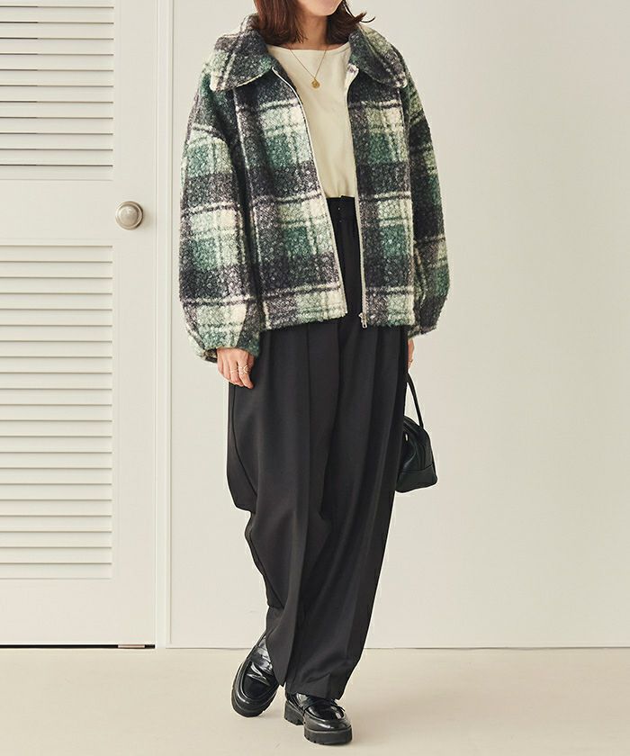 ・ふわふわのボアにチェック柄を掛け合わせた、トレンド感あふれるショートジャケット