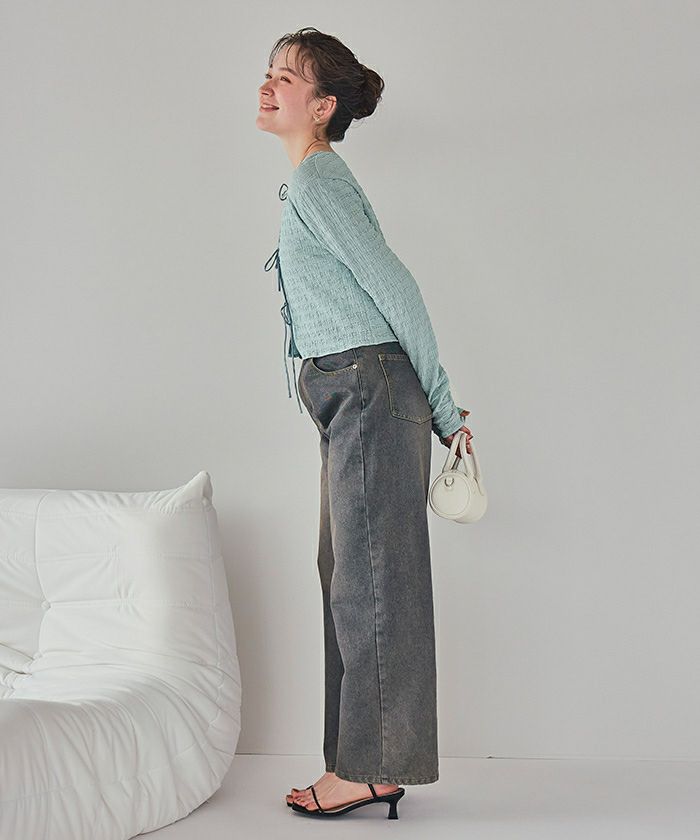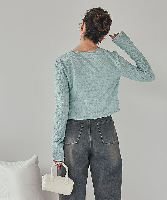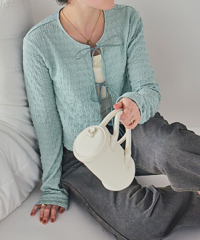 3連リボンがかわいいアクセントになって、これ1枚で華やかな雰囲気がある主役級のアイテムです。 ジャカード生地なので、こなれた印象に仕上がります。