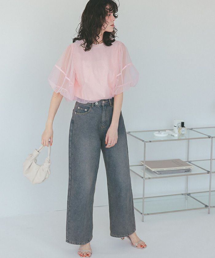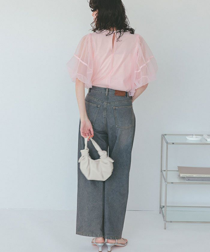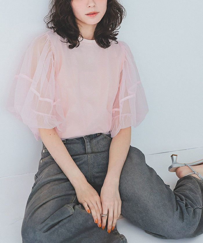 ・チュール素材がレイヤードセットになったふんわりパフスリーブの可愛いトップス