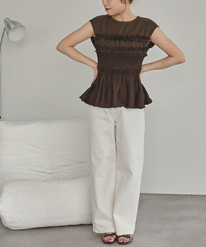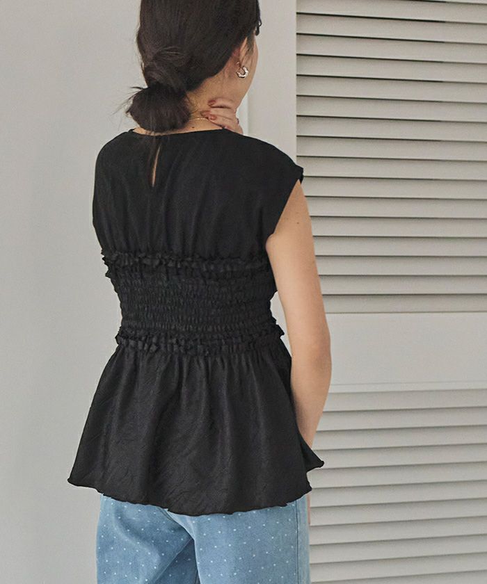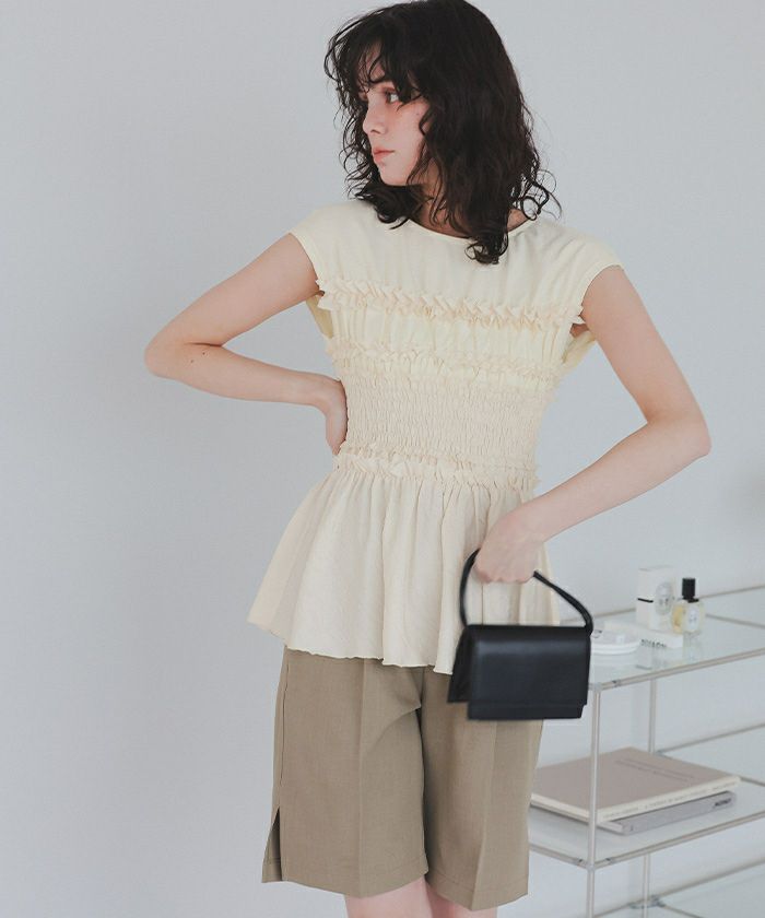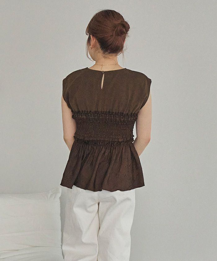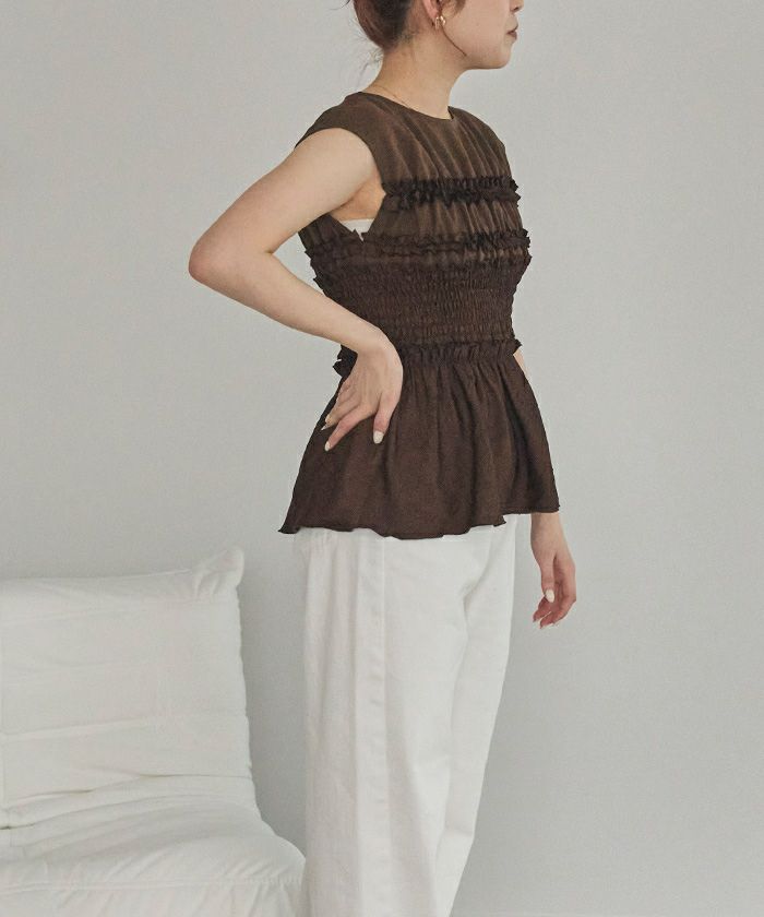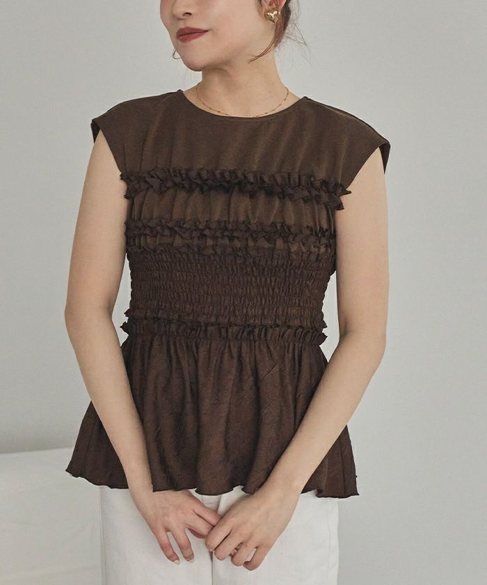 ・カットソーに布帛生地をドッキングした、シャーリングとフリルのディティールが可愛いノースリーブトップス。
