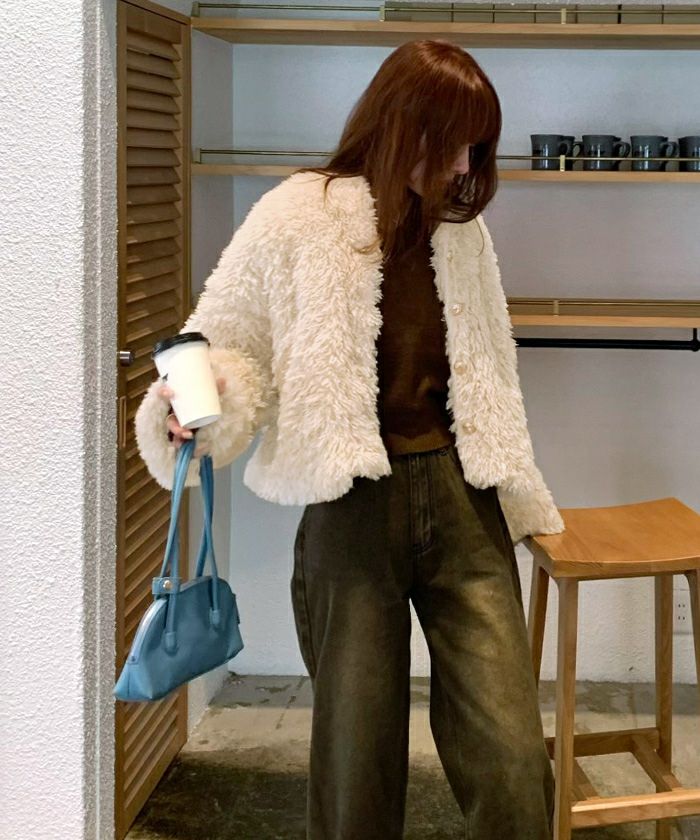 中綿が入っているので暖かさがあります。中に着込んでも大丈夫なくらいサイズに余裕があります。個人的に怒肩なので、結構ボリュームがあるように見えました。ファーが柔らかいので、使っていくうちに毛が寝てしまうように思います。ボタンが軽いのではめたり、外したりがやりにくかったです。濃いめの色のデニムに合わせて着てみましたが、ブラウンが明るめなので、見た目重すぎずかわいく着れます。プードル感が可愛くて気に入りました。今シーズンたくさん着たいと思います。
