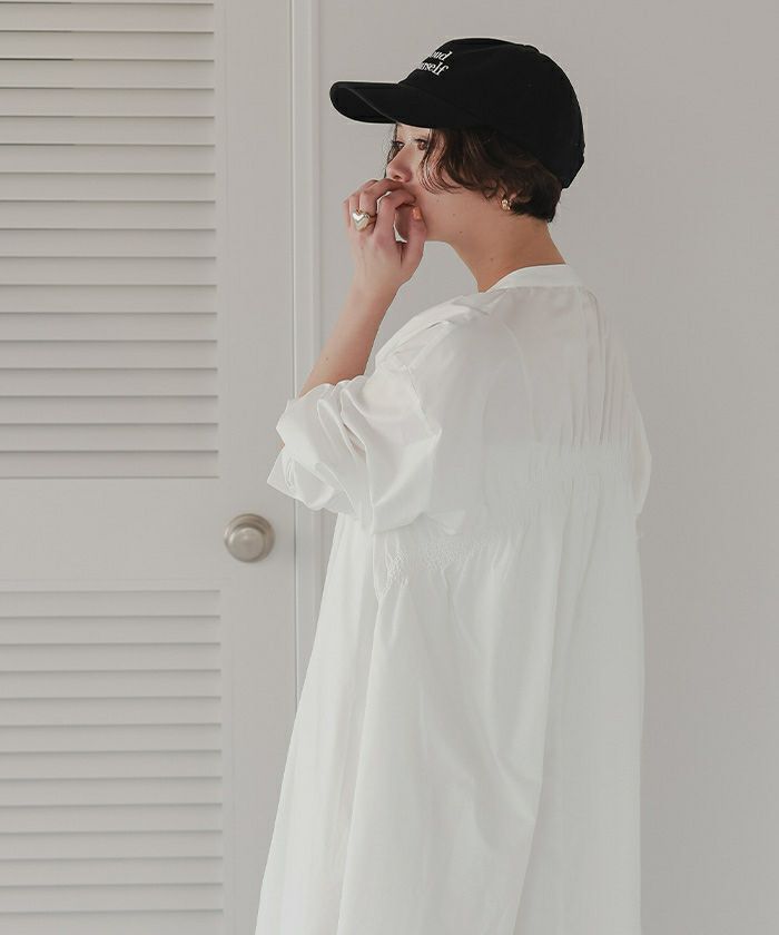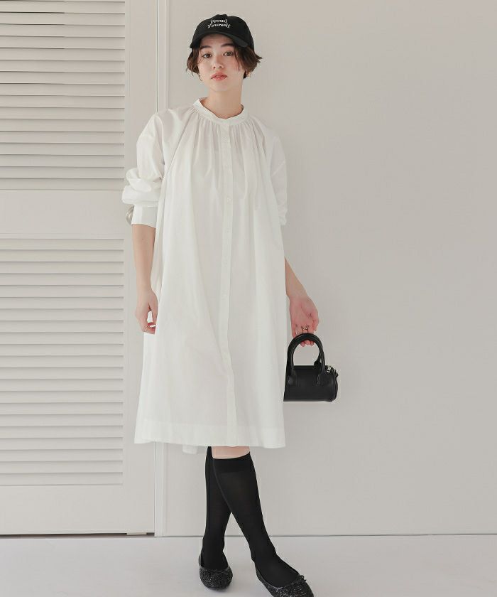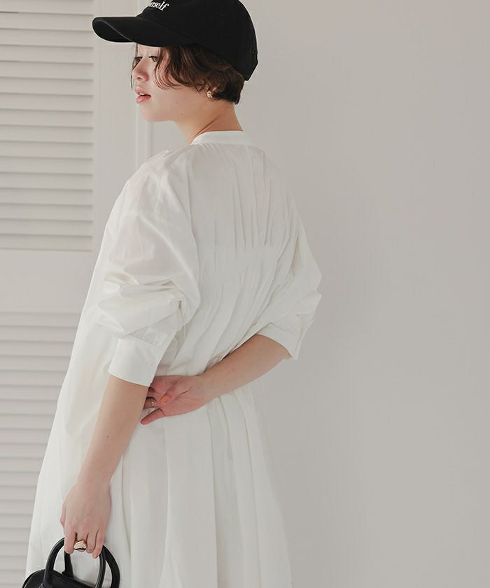 バックギャザーデザインがポイントのバンドカラーワンピース。