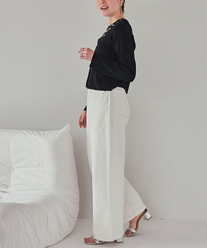 ・深めのVネックやボタンループ仕様でインナー見せを楽しめる1枚。