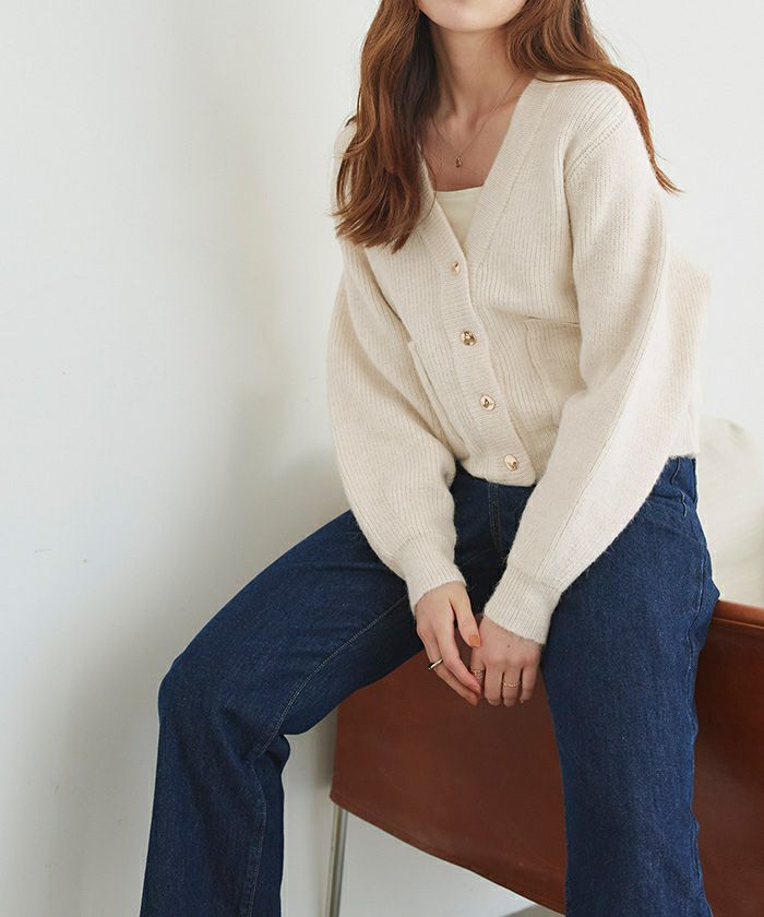 ・ゴールド釦がアクセントになった高見えニットカーディガン。