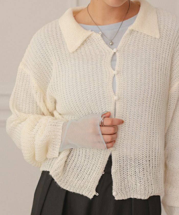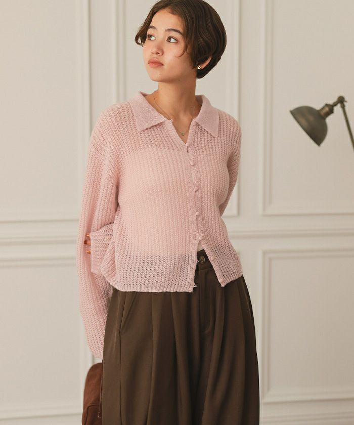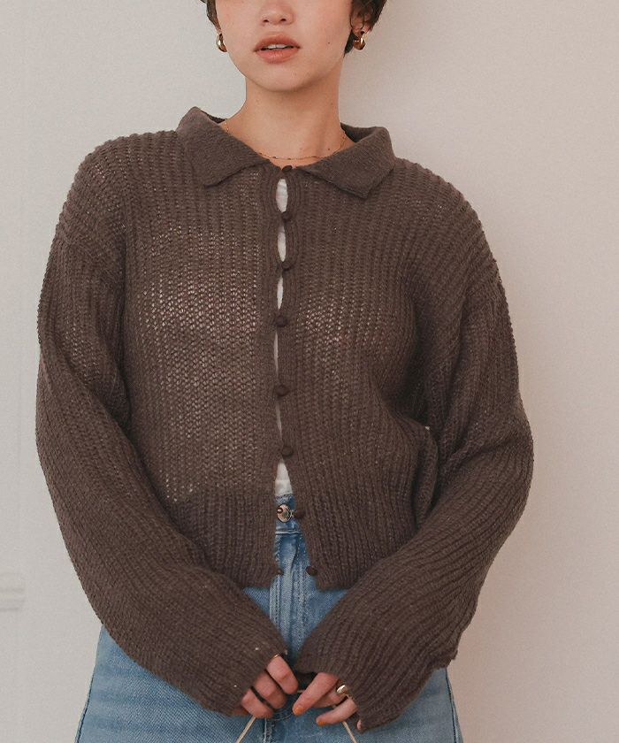 ・ポロ襟と片畦編みの立体感がほどよくカジュアルで、くるみ釦がアクセントのシアーニット