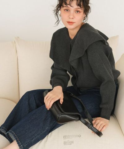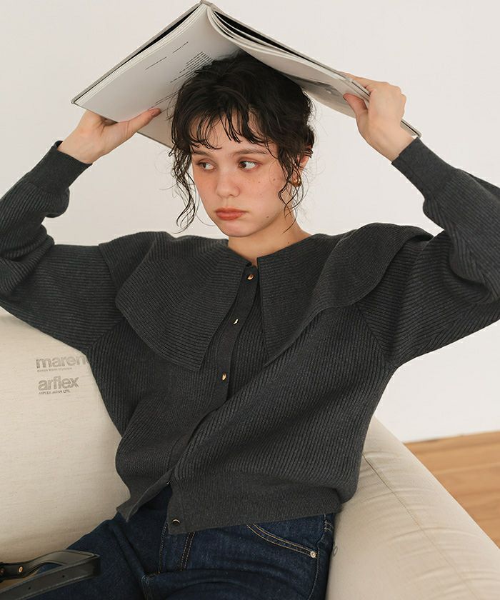 ・フレア襟が顔まわりを華やかに魅せてくれるデザインカーディガン
