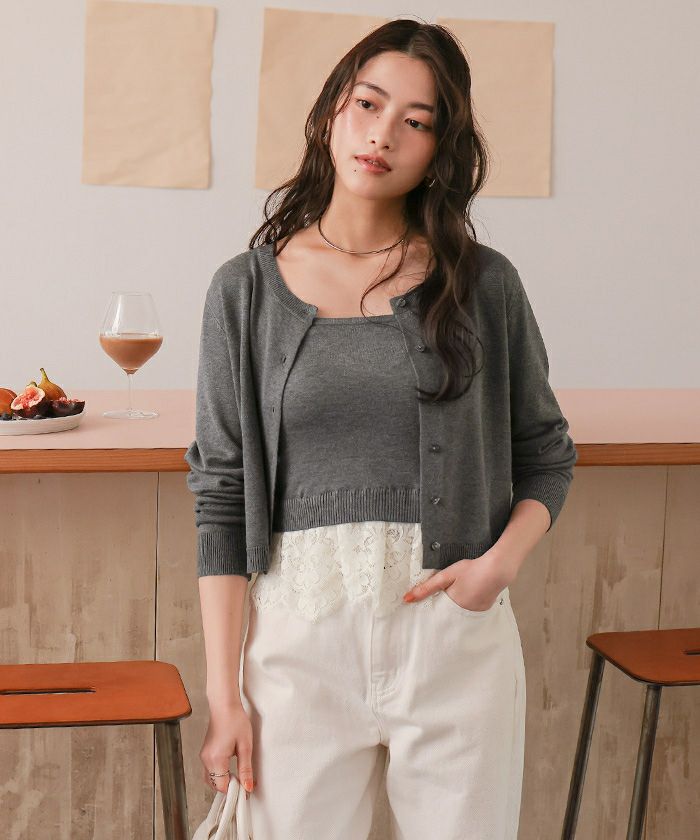 ・繊細なレースヘムが覗くキャミソール×程よく力の抜けたカーデのセットで、1枚で完成する旬のレイヤード感