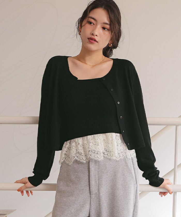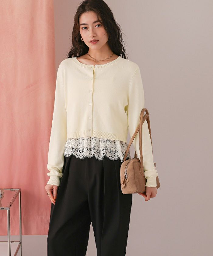 ・カーデはリラクシーなシルエットで、コンパクトすぎず、抜け感を演出。ボタンを留めれば裾からレースが覗く上品なルックに