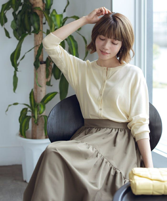 ・さらっと落ち感のあるライトニット素材を使用したクルーネックカーディガン。