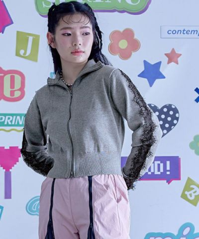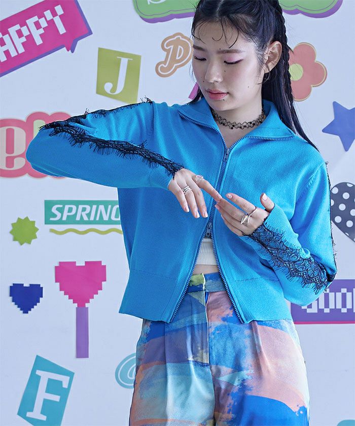 ・袖のレースラインが女性らしいジップカーディガン。