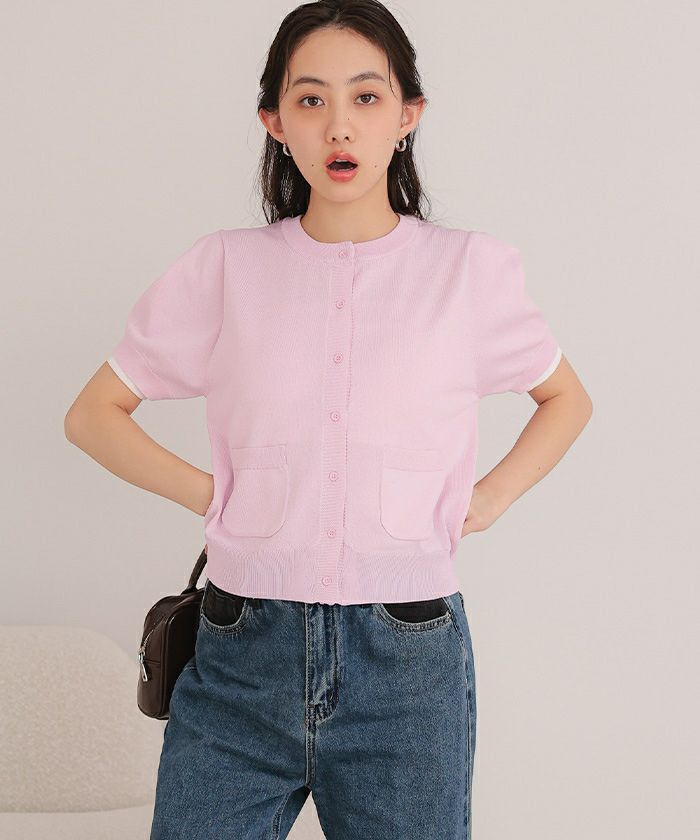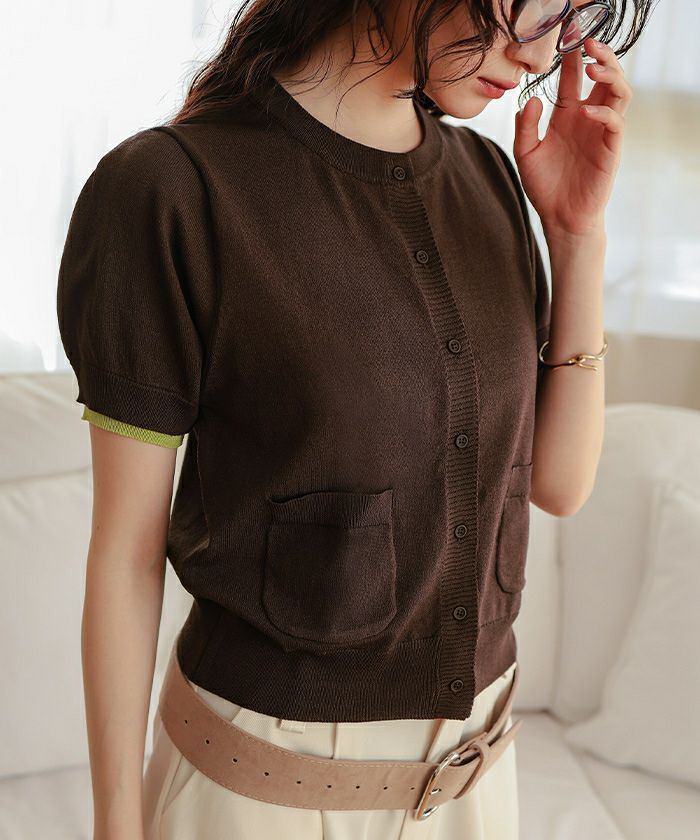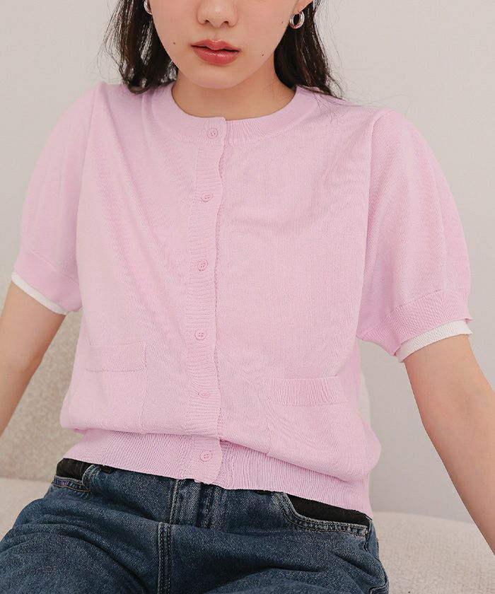 ・袖口の配色がさりげないアクセントになる、サマーニット半袖カーディガン