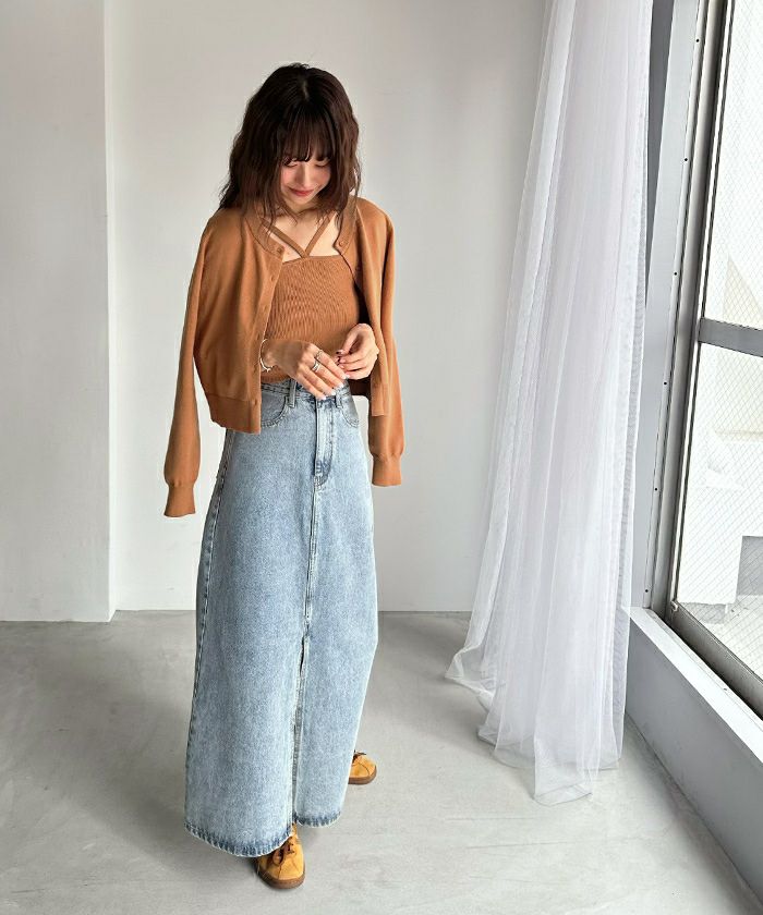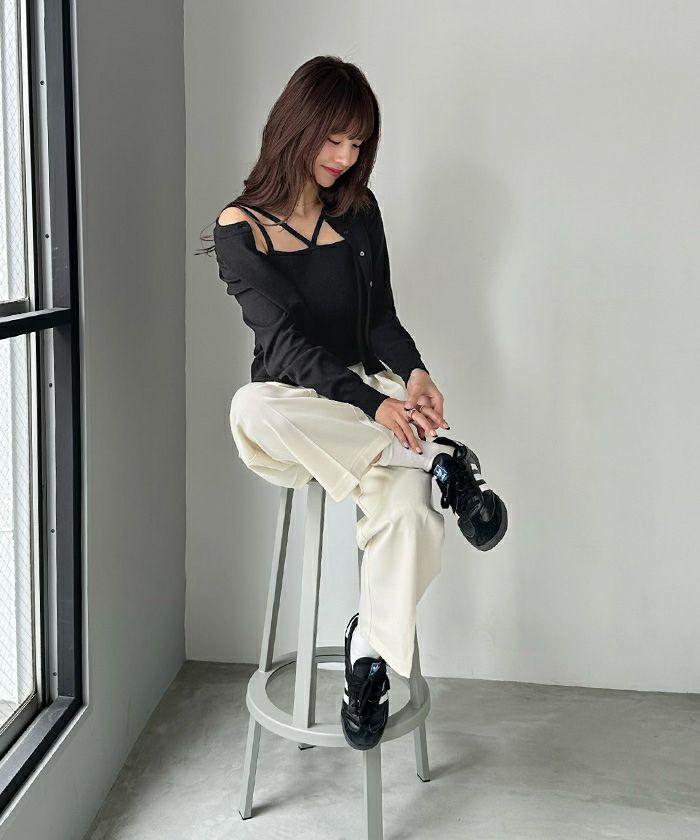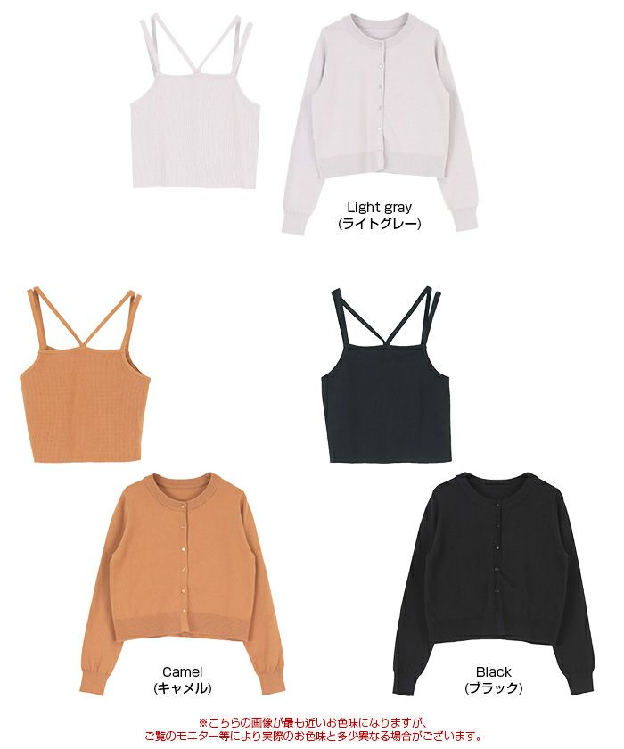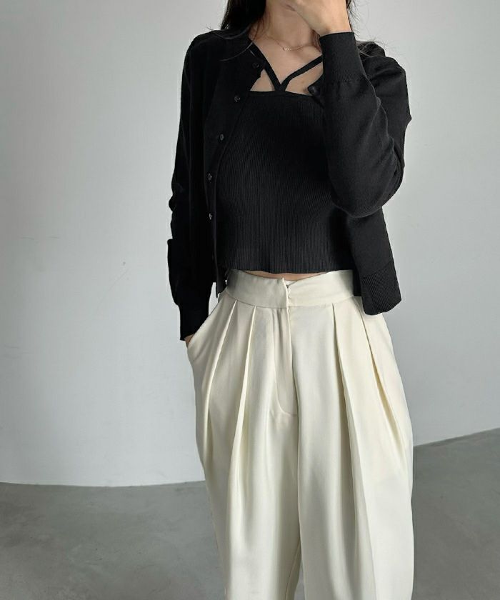・デザイン性のあるキャミトップスとカーディガンのアンサンブル。