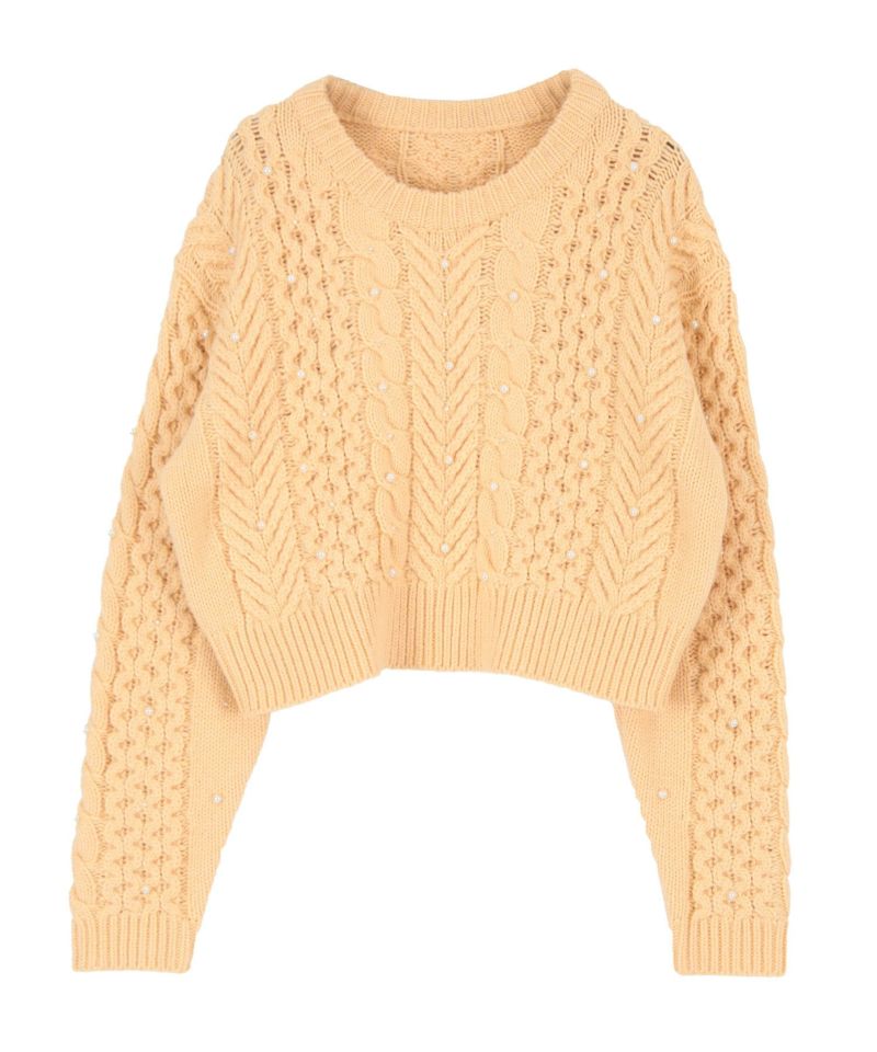 ・大小大きさの違うパールをランダムに散りばめ、女性らしさのある華やかでフェミニンな印象のケーブルニットに。