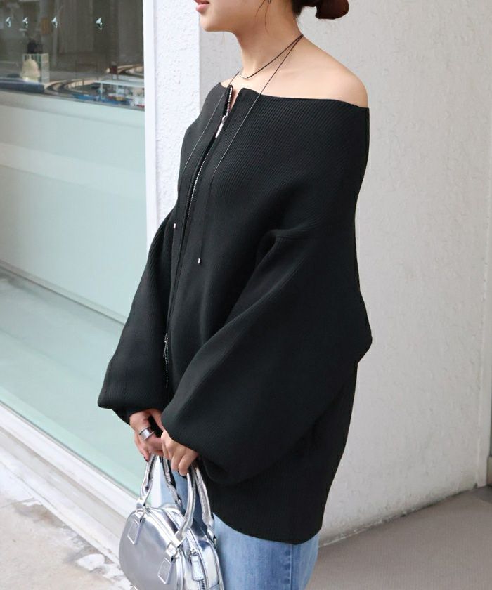 ・肩を出してオフショルダーでも、少し上げてボートネックでも着られる、大人可愛いカジュアルニットです。