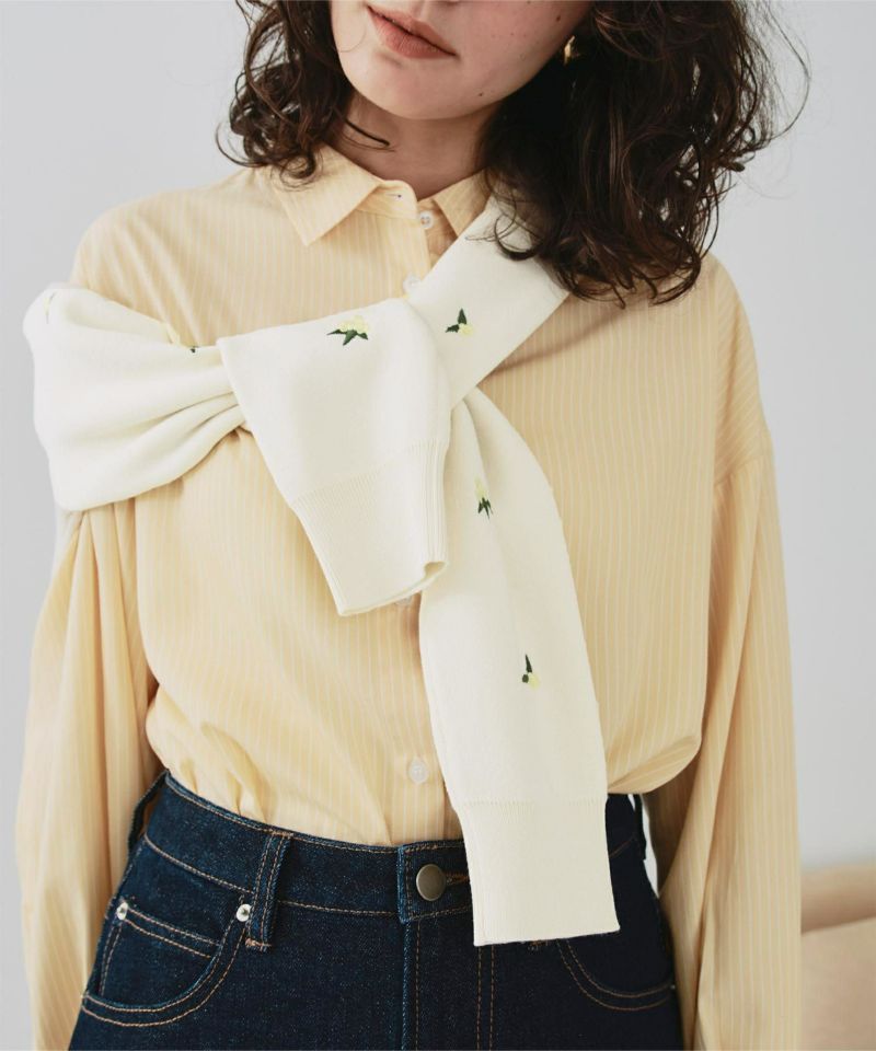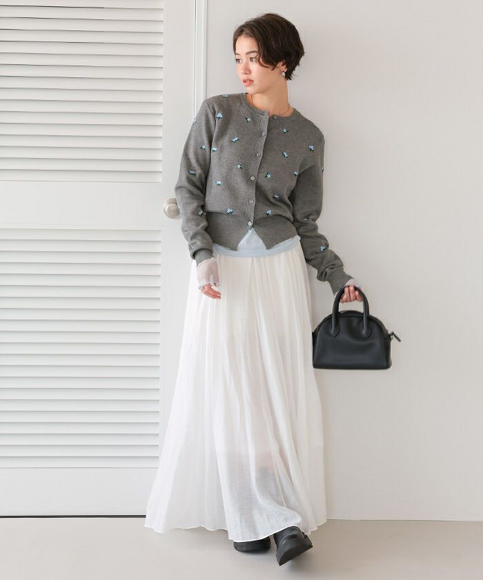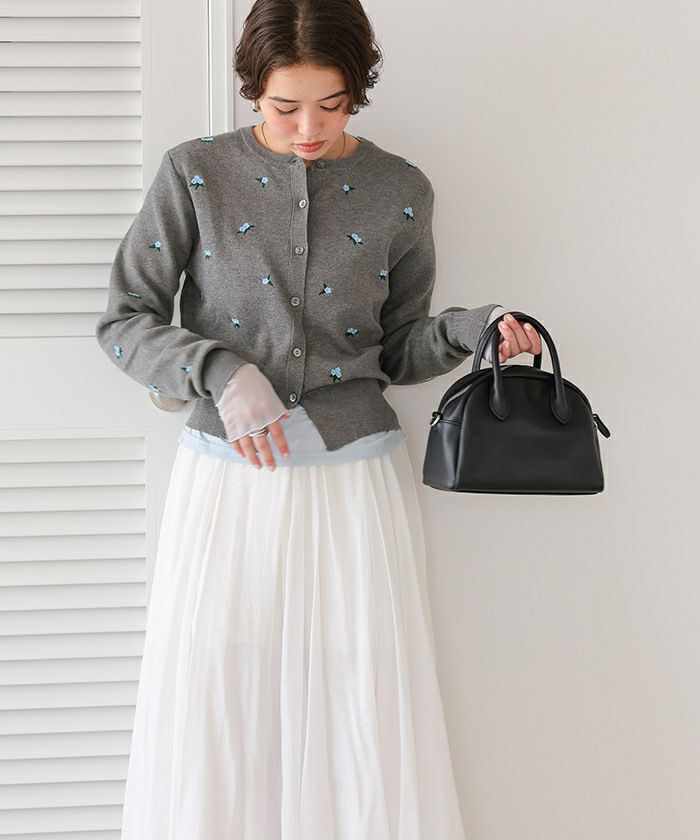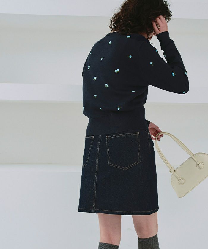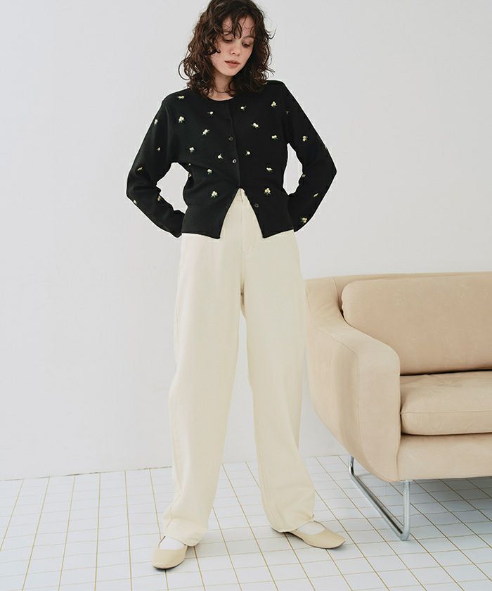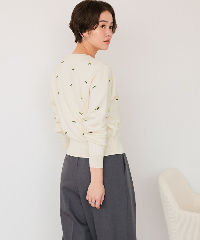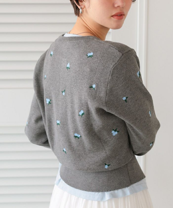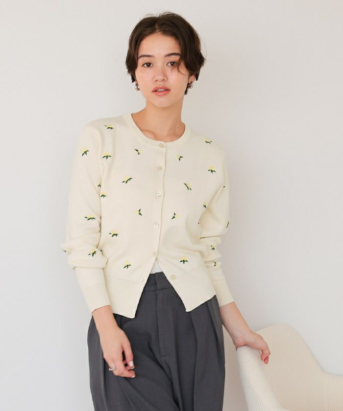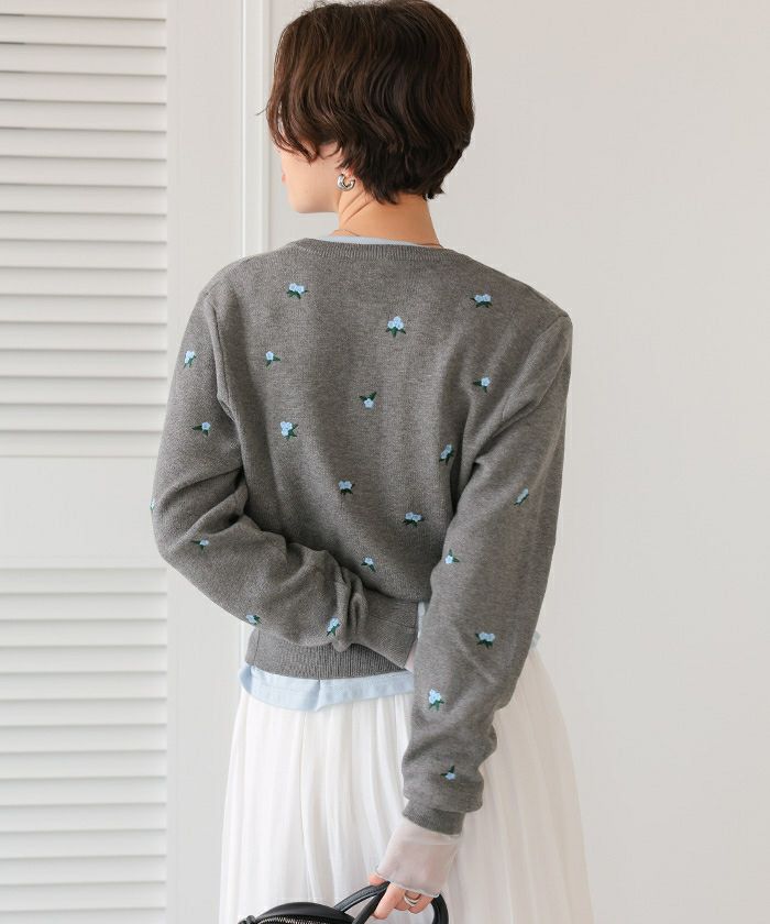 ・フラワー刺繍がかわいらしい、程よいコンパクトフォルムのニットカーディガン