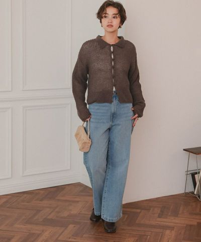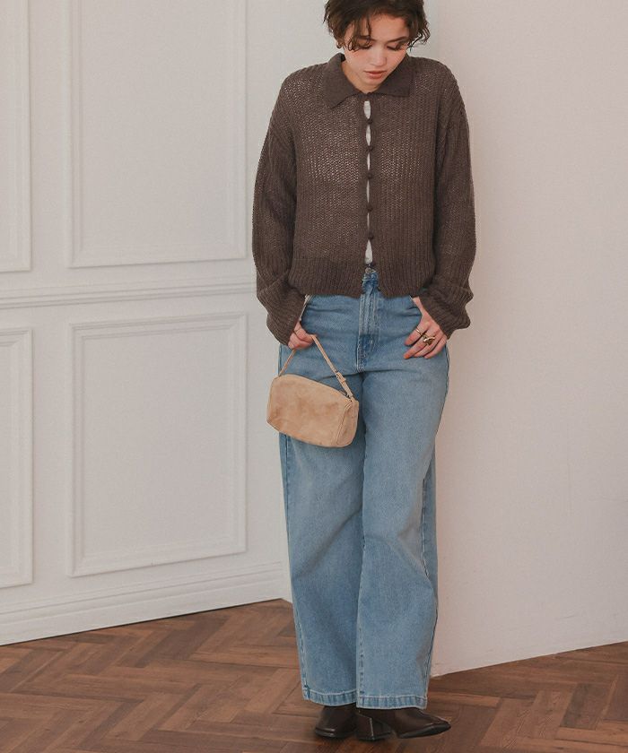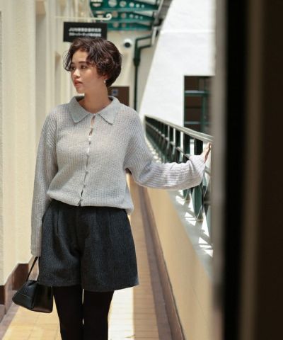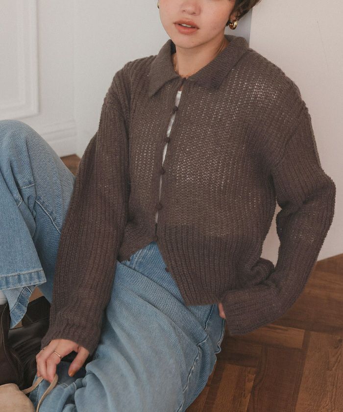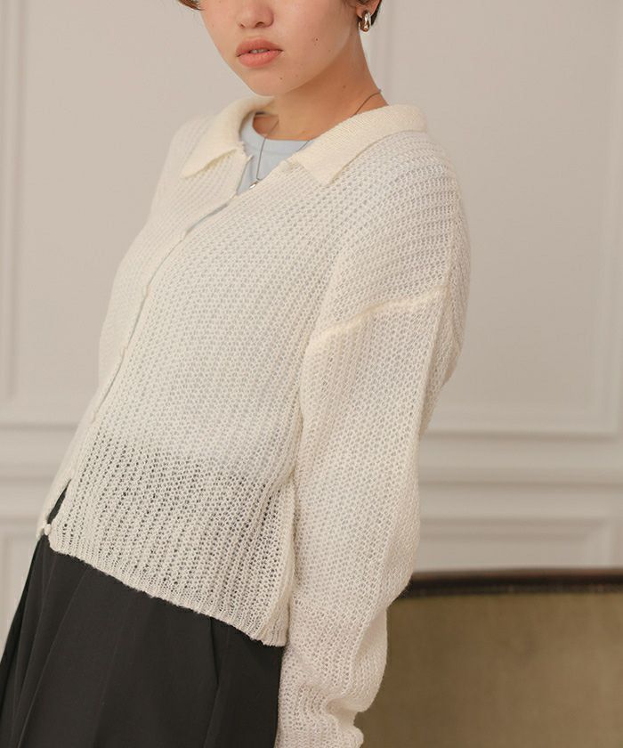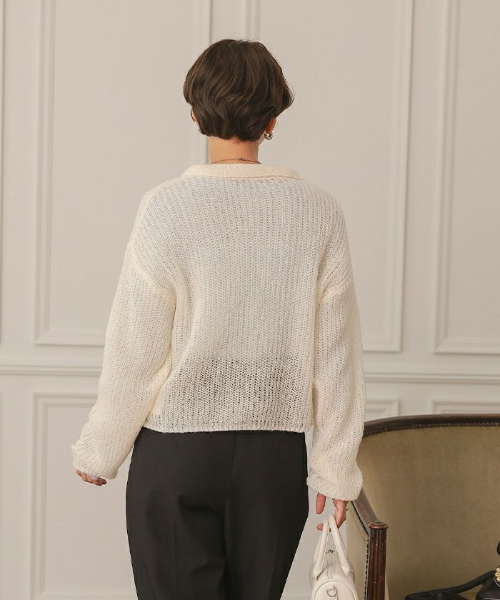 ・ポロ襟と片畦編みの立体感がほどよくカジュアルで、くるみ釦がアクセントのシアーニット