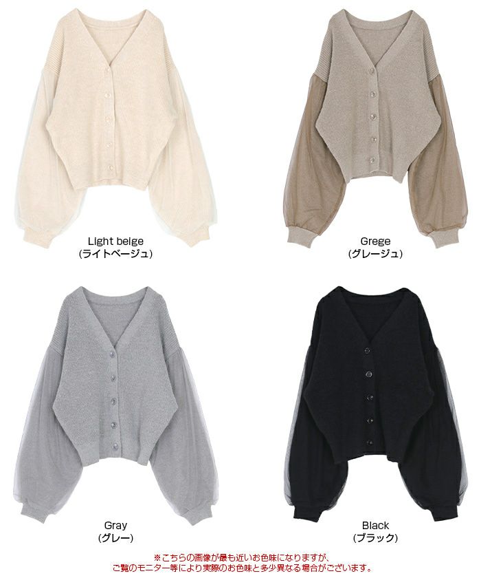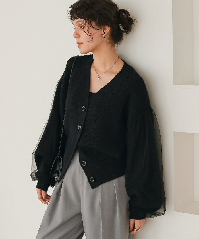 袖チュールVネックニットカーディガン