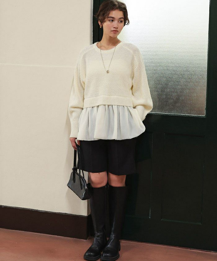 ・ニットトップスに少し透け感のある生地がドッキングされた、1枚で着映えするトップス