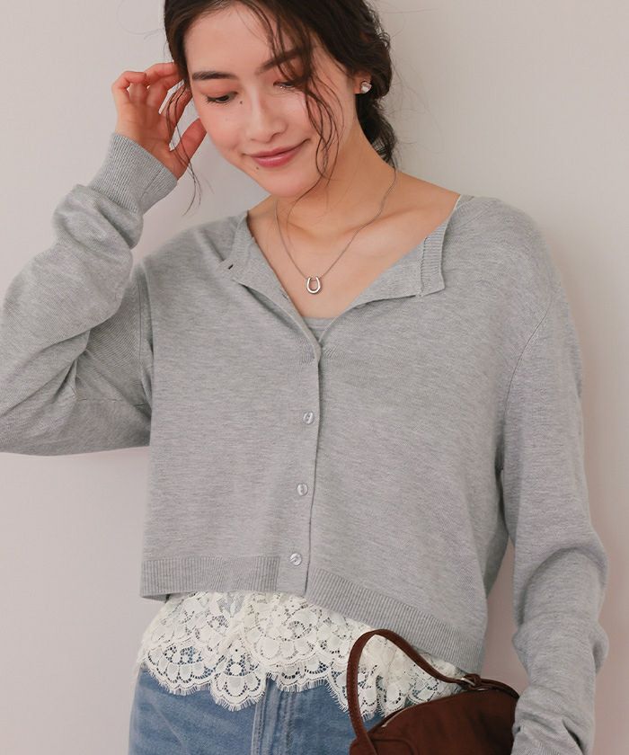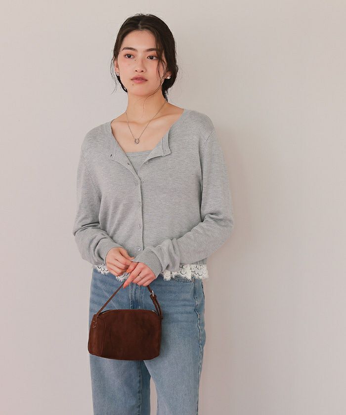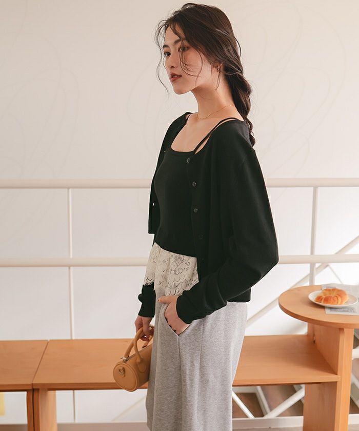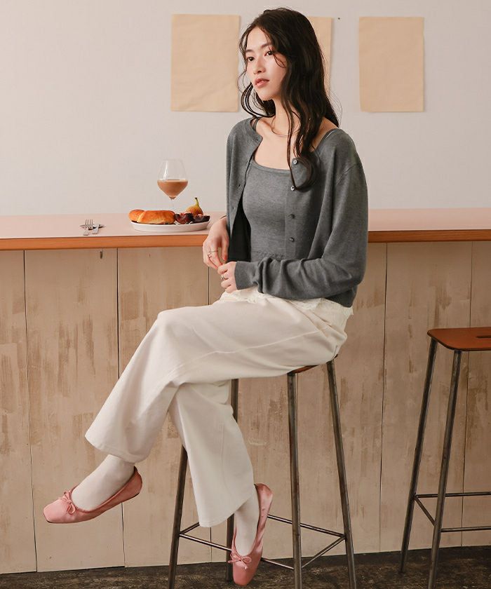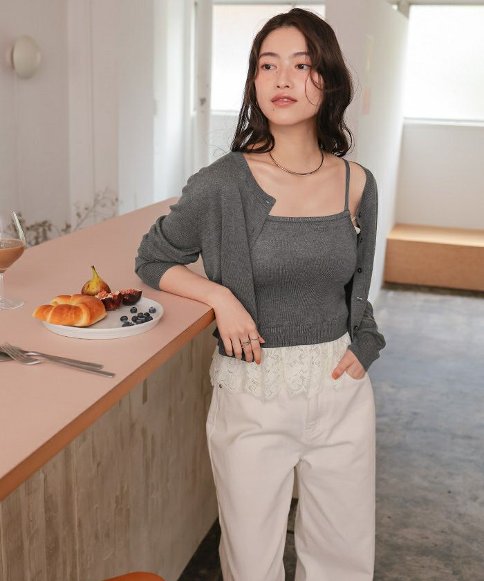 ・繊細なレースヘムが覗くキャミソール×程よく力の抜けたカーデのセットで、1枚で完成する旬のレイヤード感