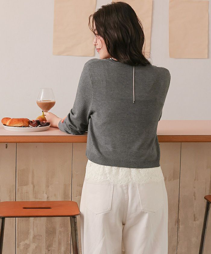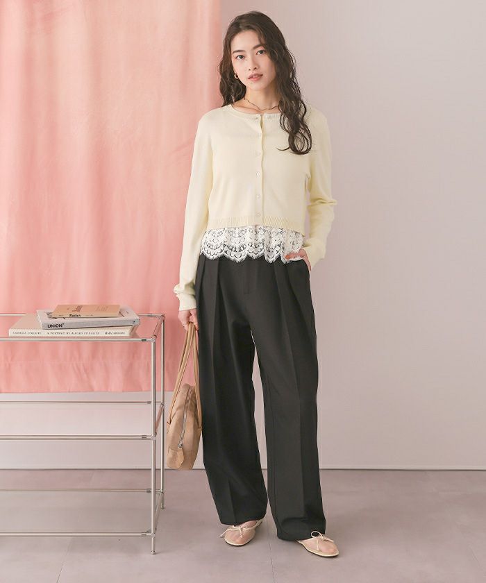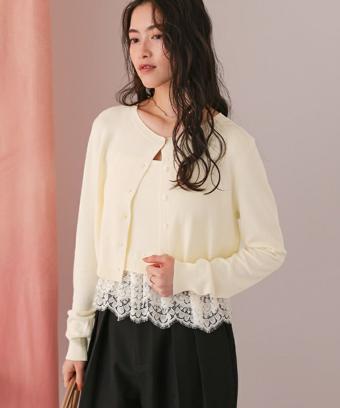・カーデはリラクシーなシルエットで、コンパクトすぎず、抜け感を演出。ボタンを留めれば裾からレースが覗く上品なルックに