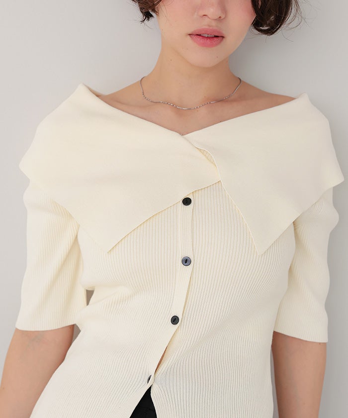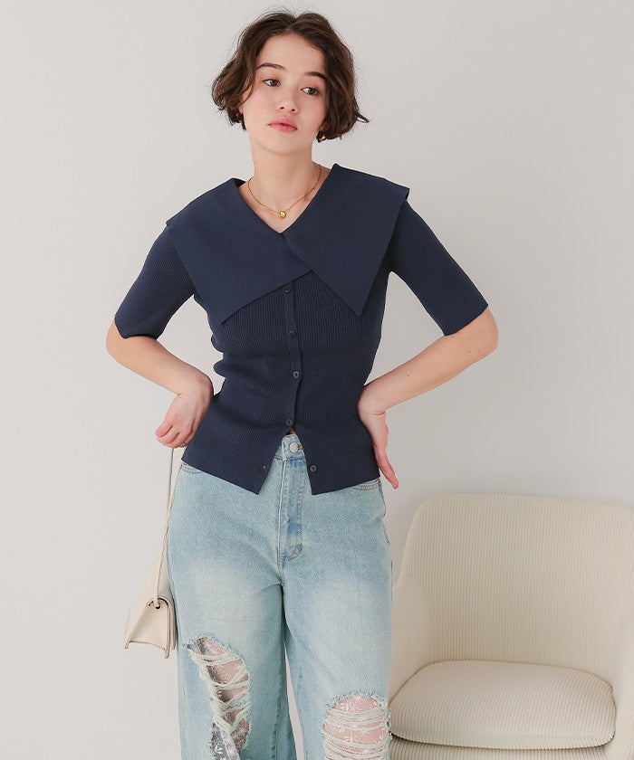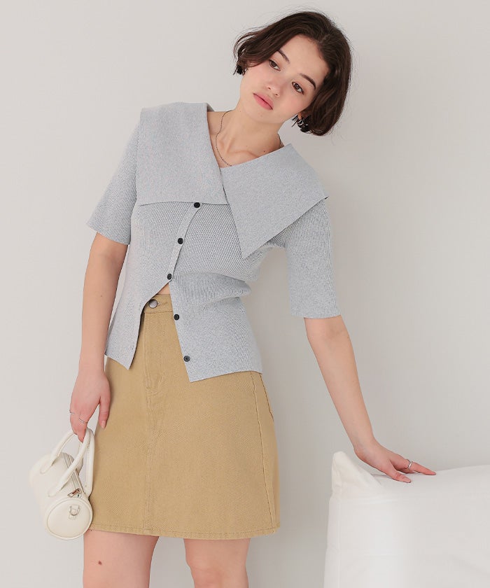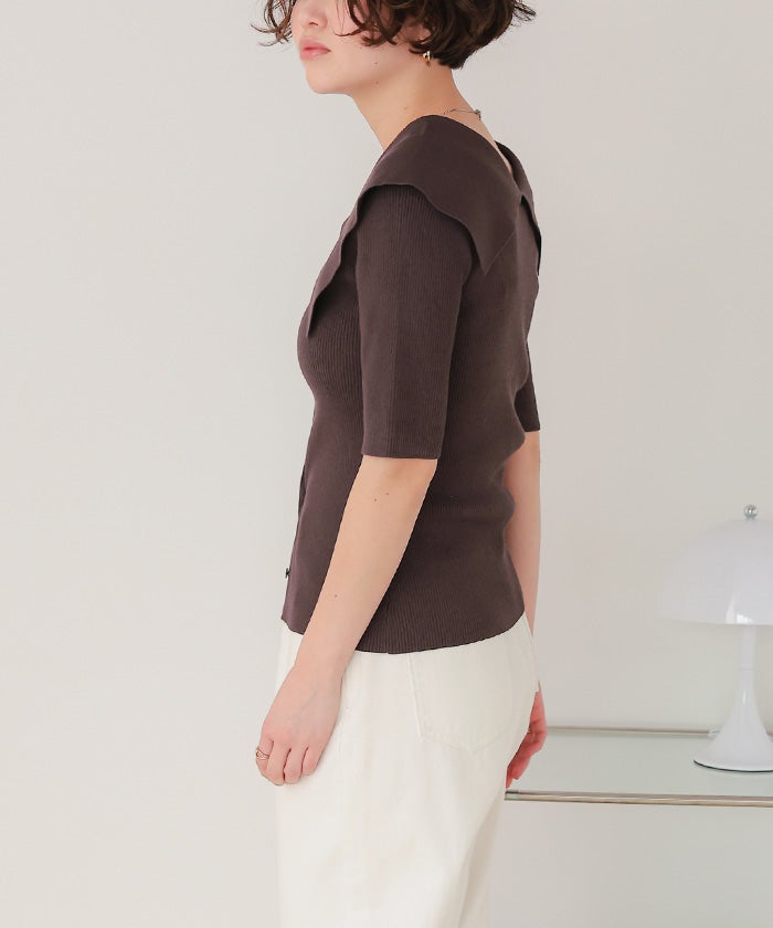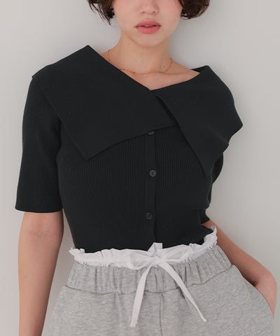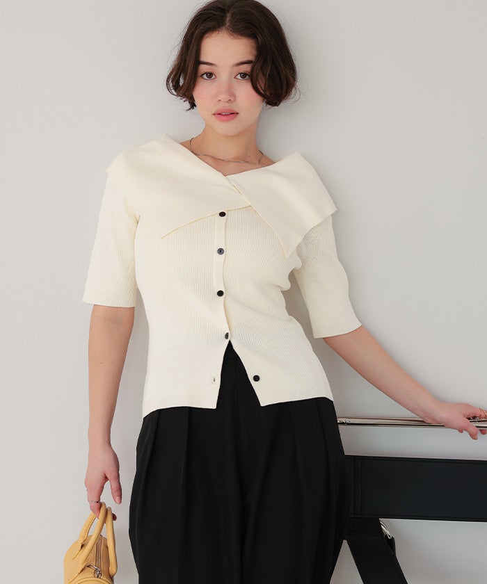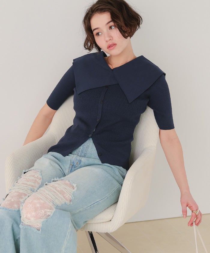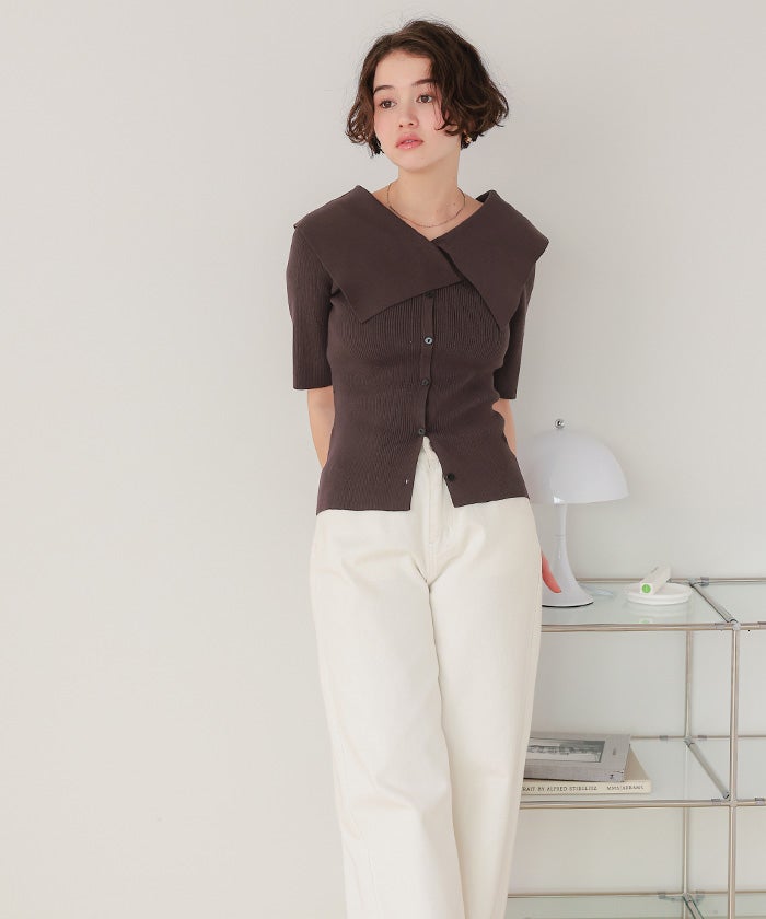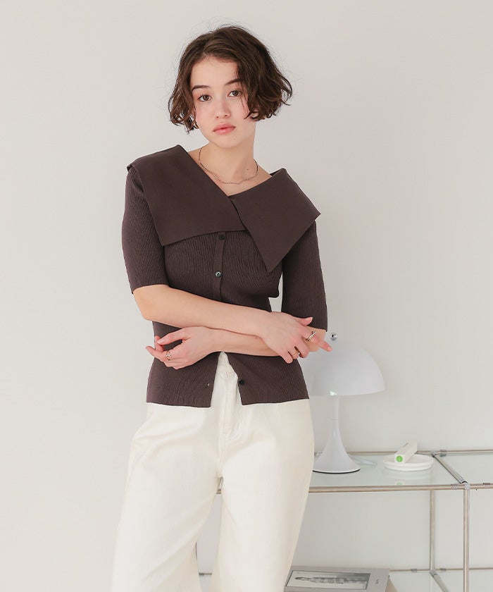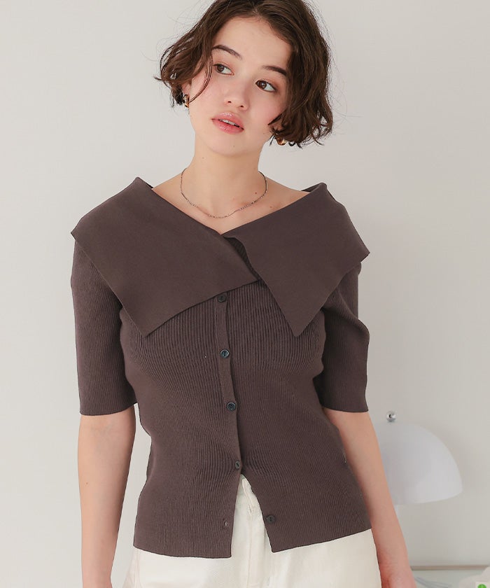 UVケア/抗ピルビッグカラー半袖リブニット