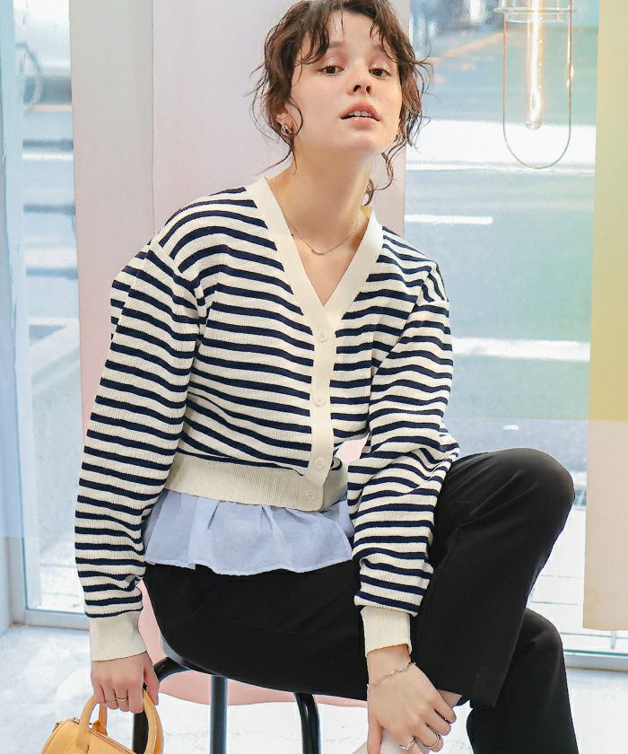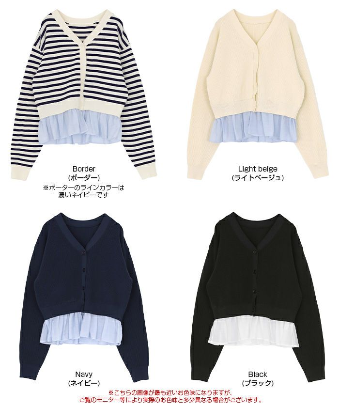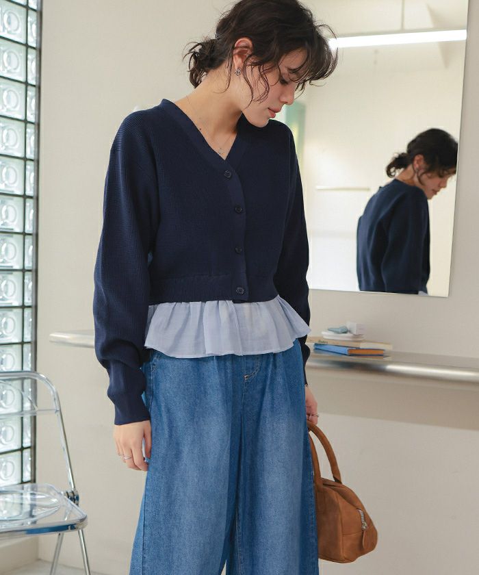 商品情報 ・裾のふんわりドッキングフリルが、着こなしに上品な甘さを添える映えデザインカーディガン