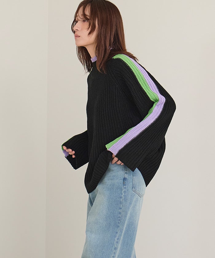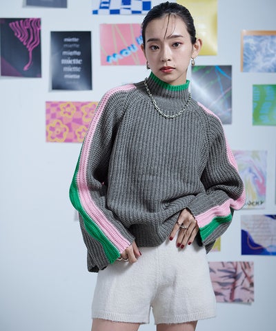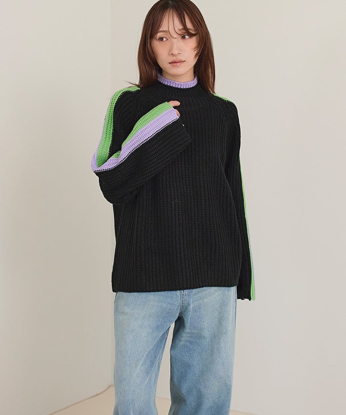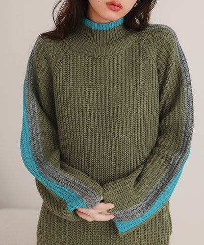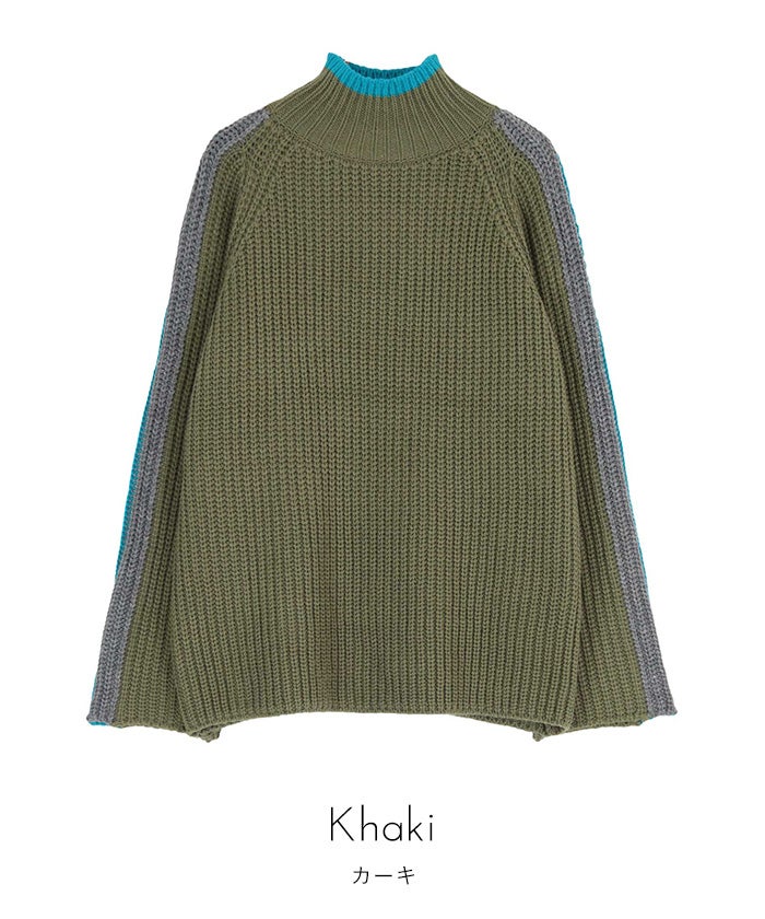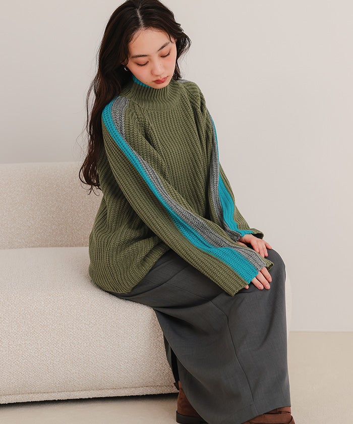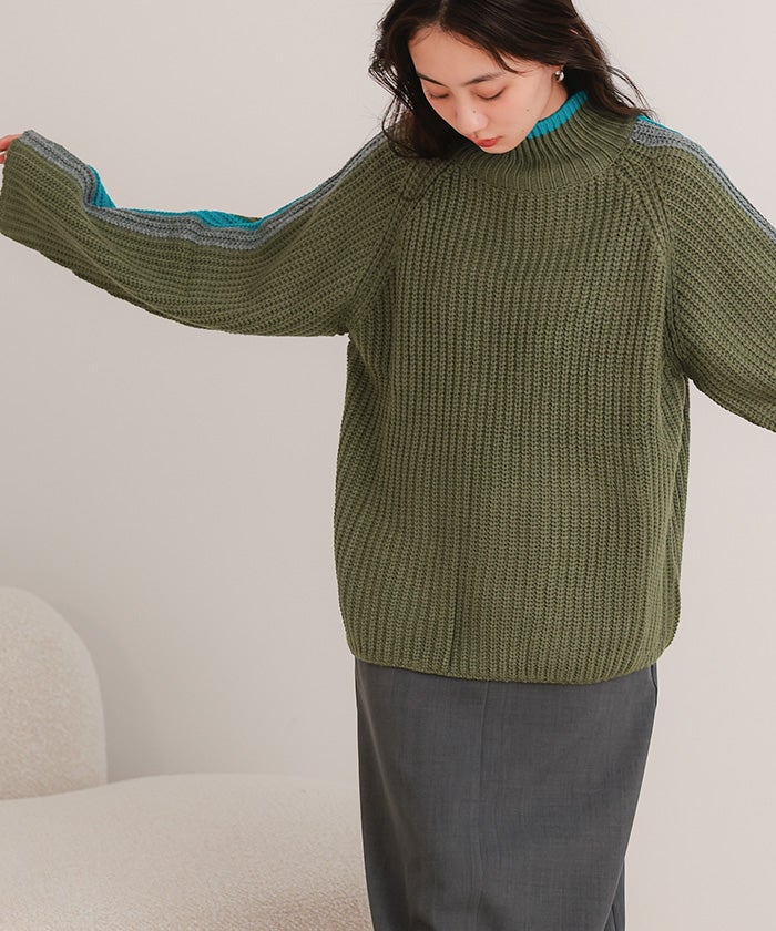 ・袖の2色の配色ラインがポイントのハイネックニット。