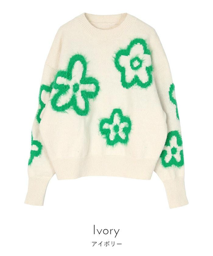 ・暖かみのあるシャギー素材のフラワー柄が可愛いニットトップス。