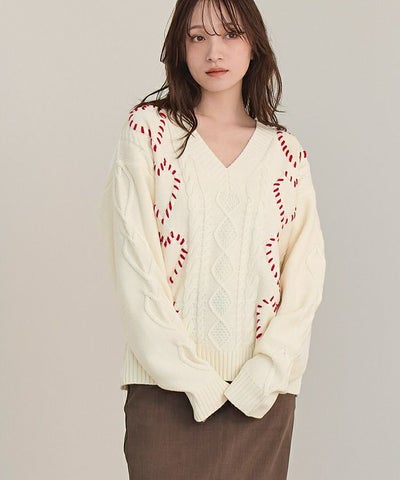 配色ステッチハートケーブルVネックニット【miette ミエット】