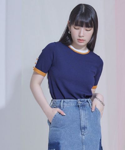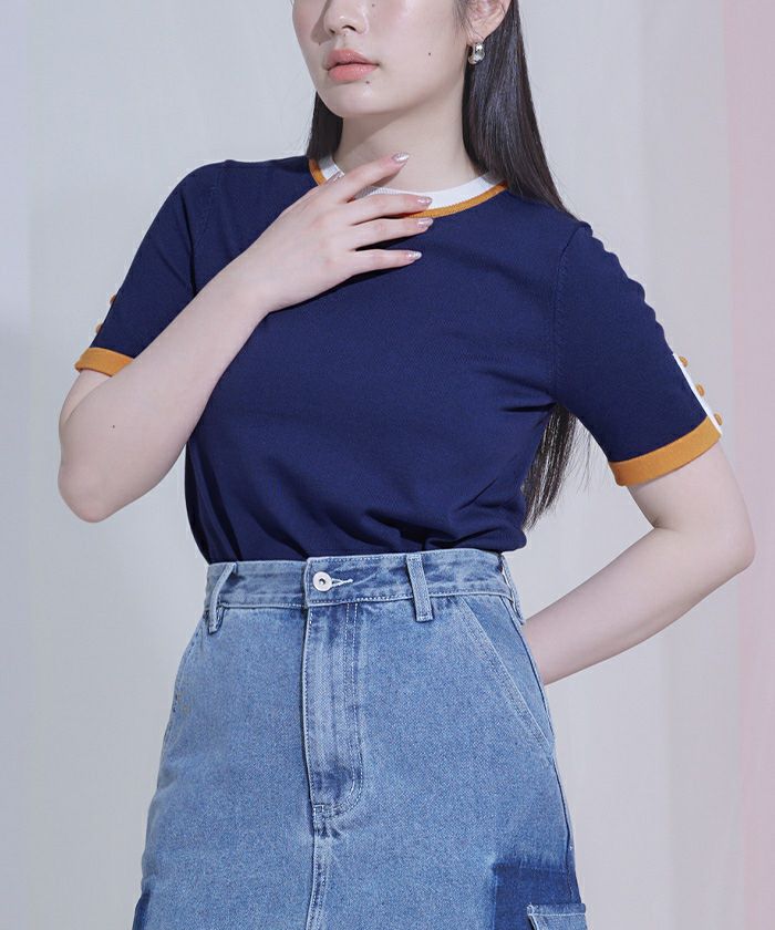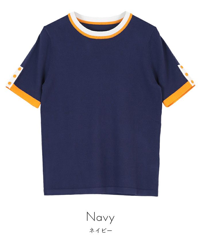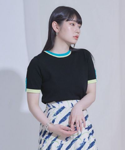 ・袖口と襟ぐりの配色ラインが映えるデザイン。