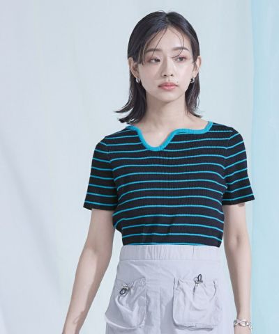 ウェーブネックラインボーダー半袖トップス【miette ミエット】【メール便可/100】