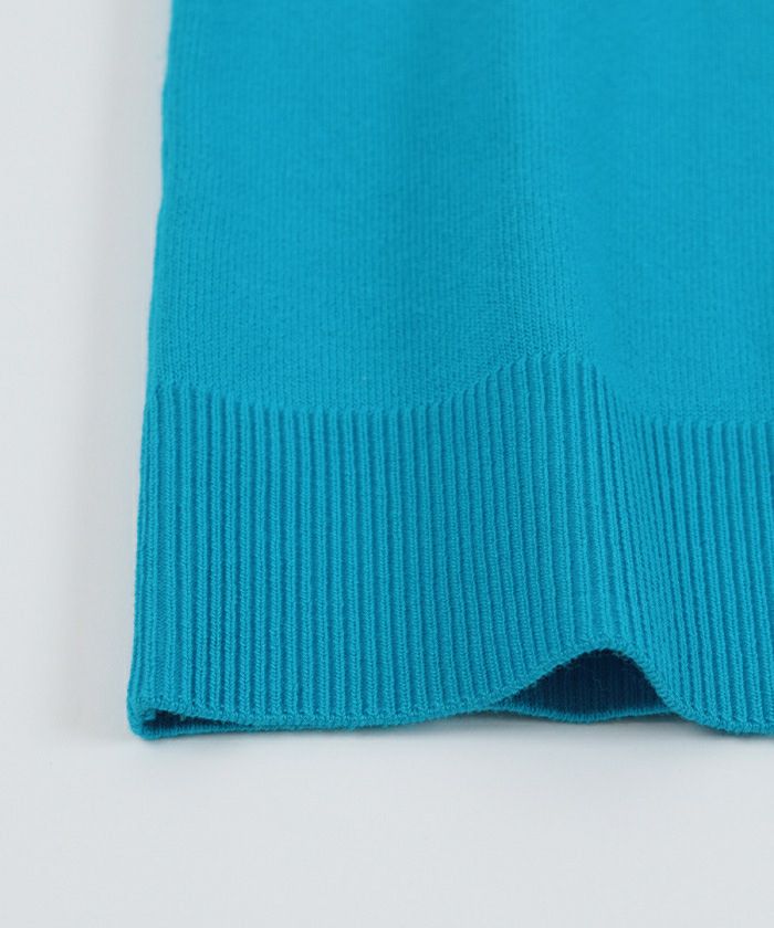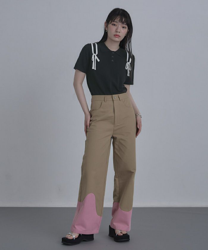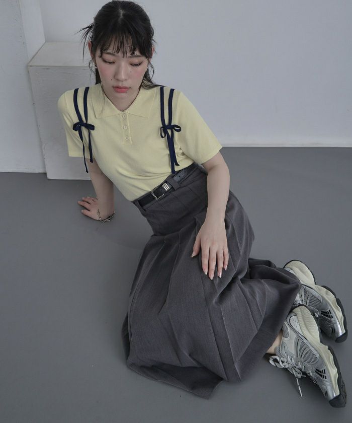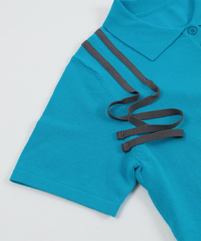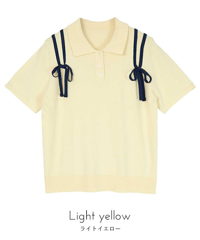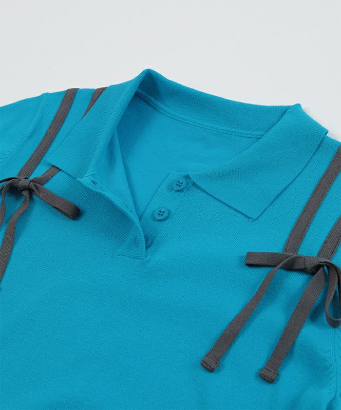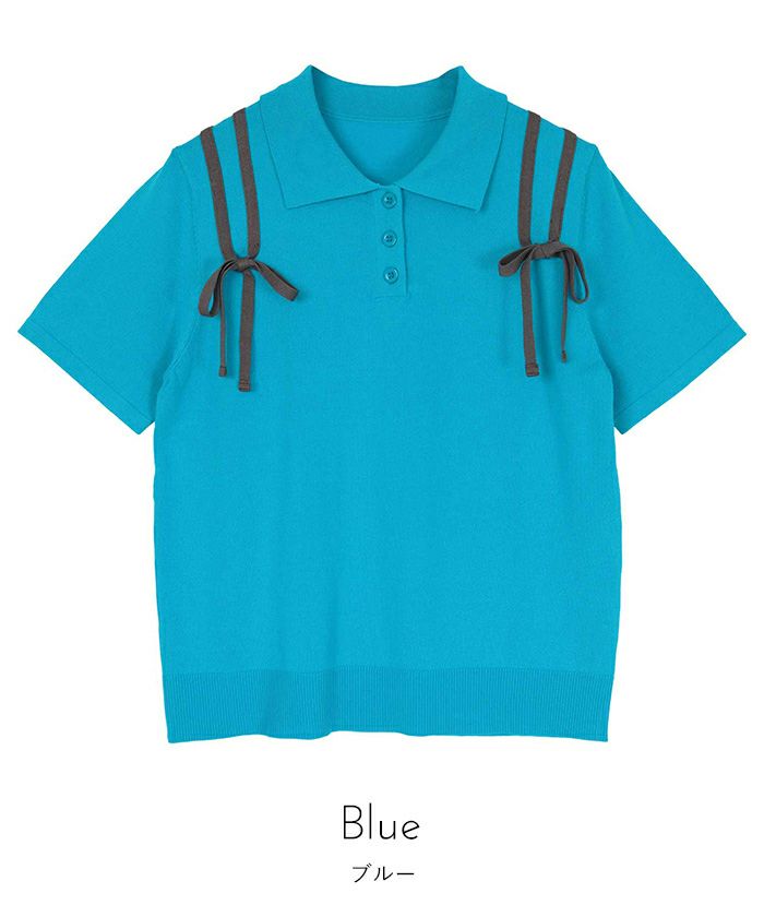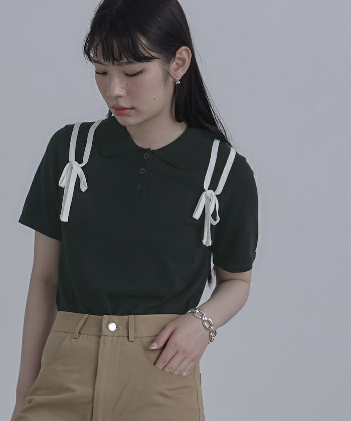 ・肩に配色のリボンテープをあしらった半袖ポロニット。