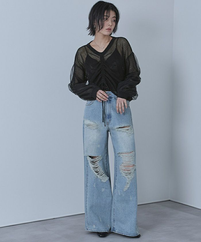 こちらの製品は素材感と雰囲気を重視し、オシャレ感を表現するために非常に柔らかい風合いの生地を使用しています。激しい運動や強度な力が加われば縫い目が開いたり、目寄れ(織り糸の滑り目が開く)する性質をもっています。この点をご留意の上ご着用ください。