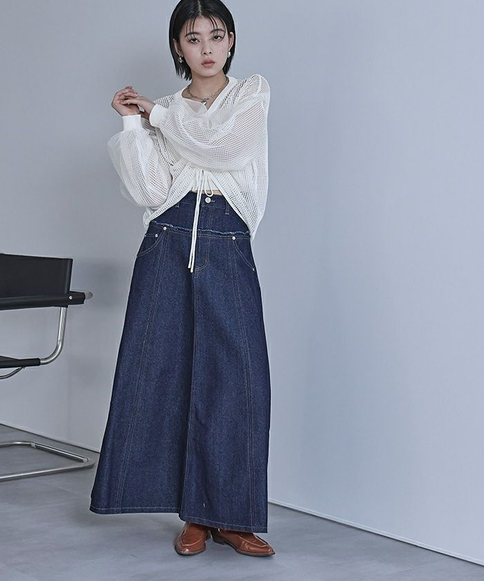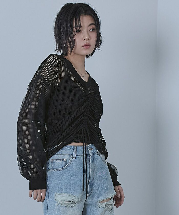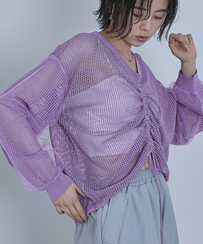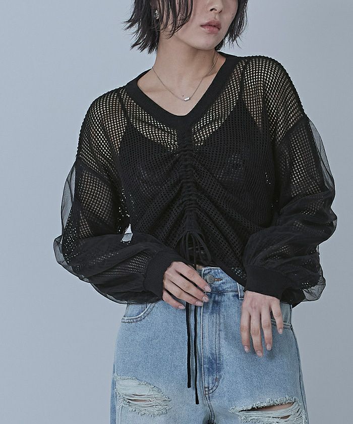 ・抜け感のある透かし編みに袖だけチュールをドッキングしたデザイン