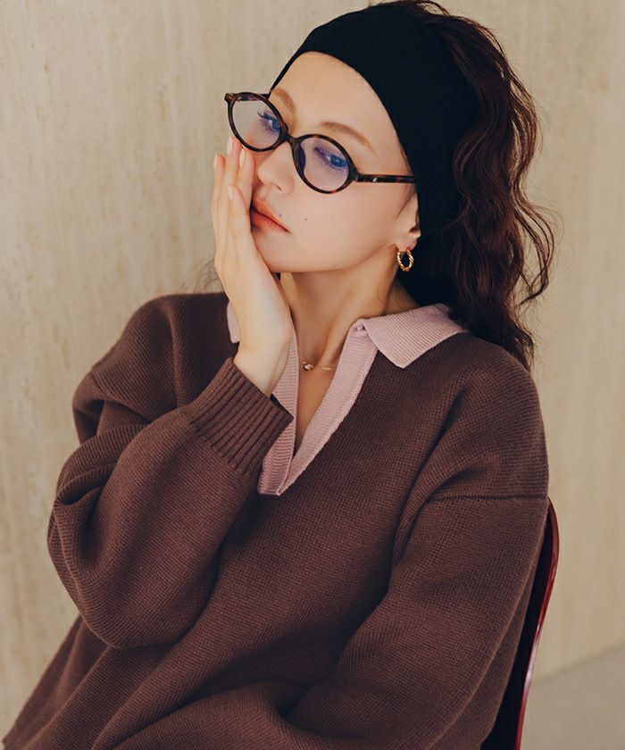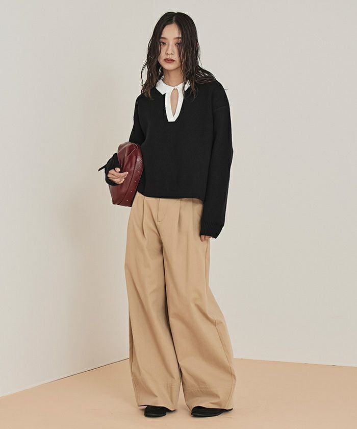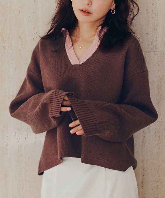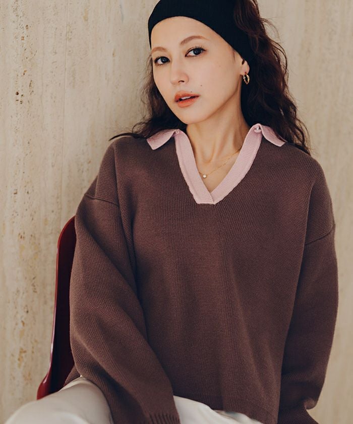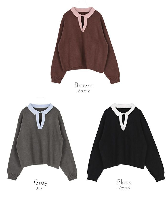 ・一枚で目を惹く襟配色スキッパーニットプルオーバー