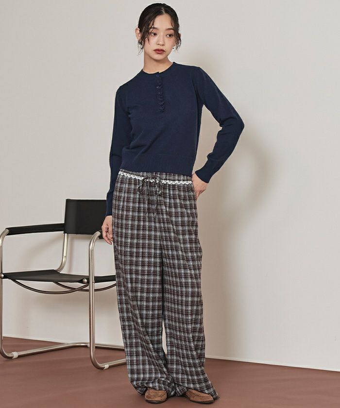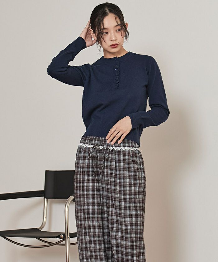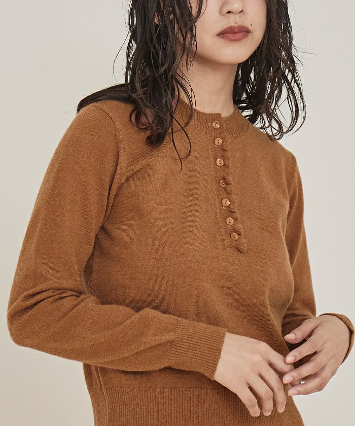 ・コンパクトなシルエットで前立てに細かなフリルをあしらった上品なヘンリーネックニット
