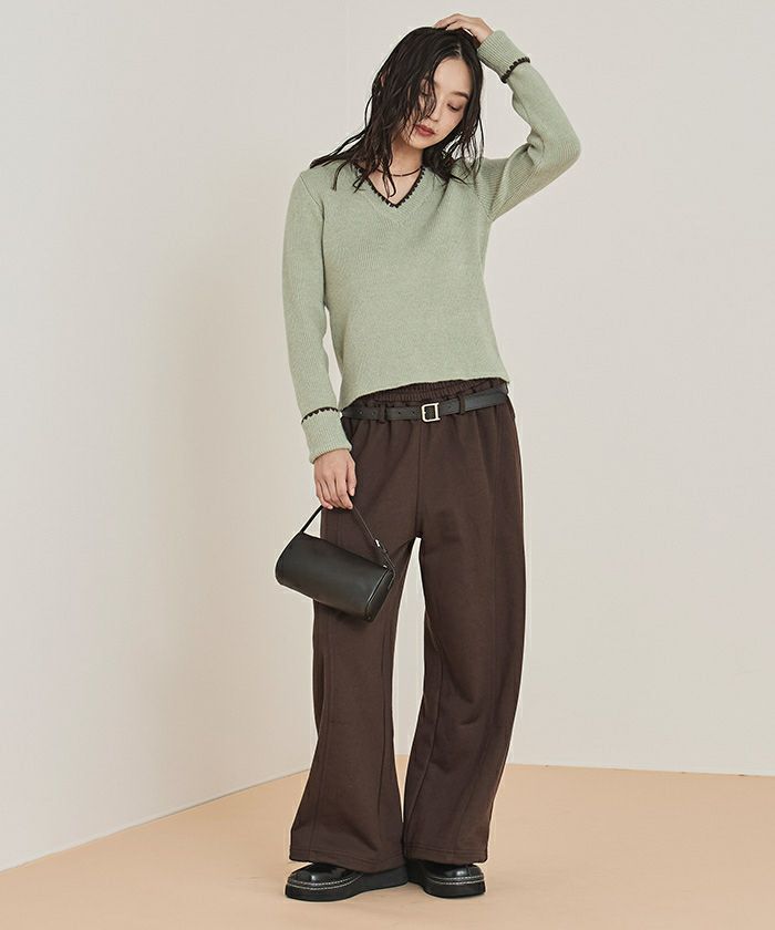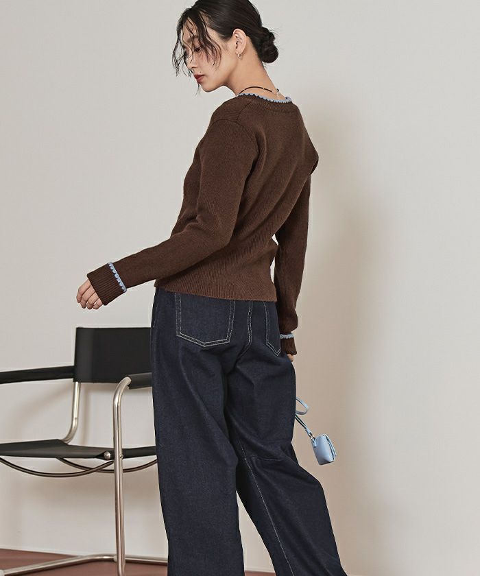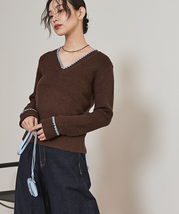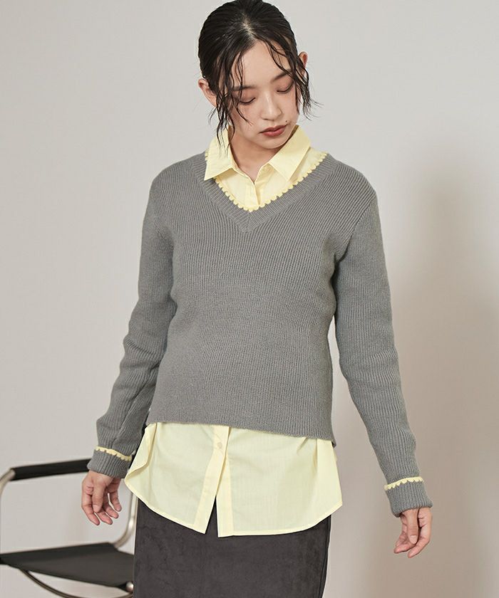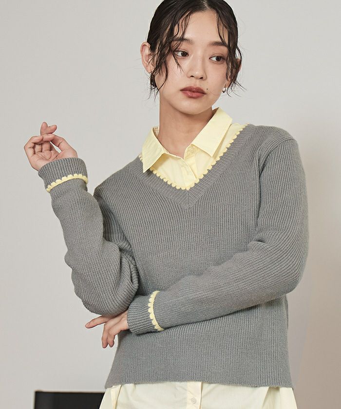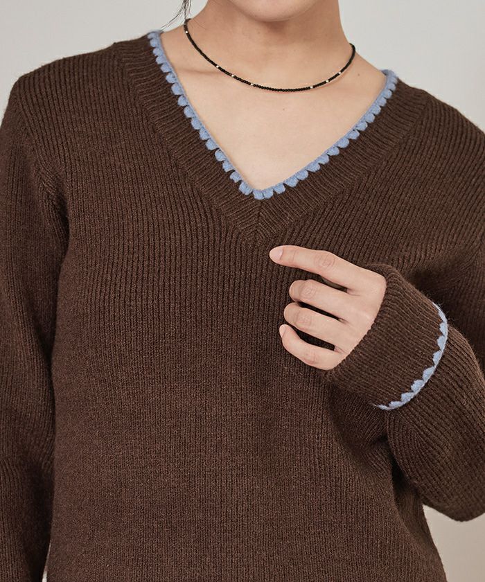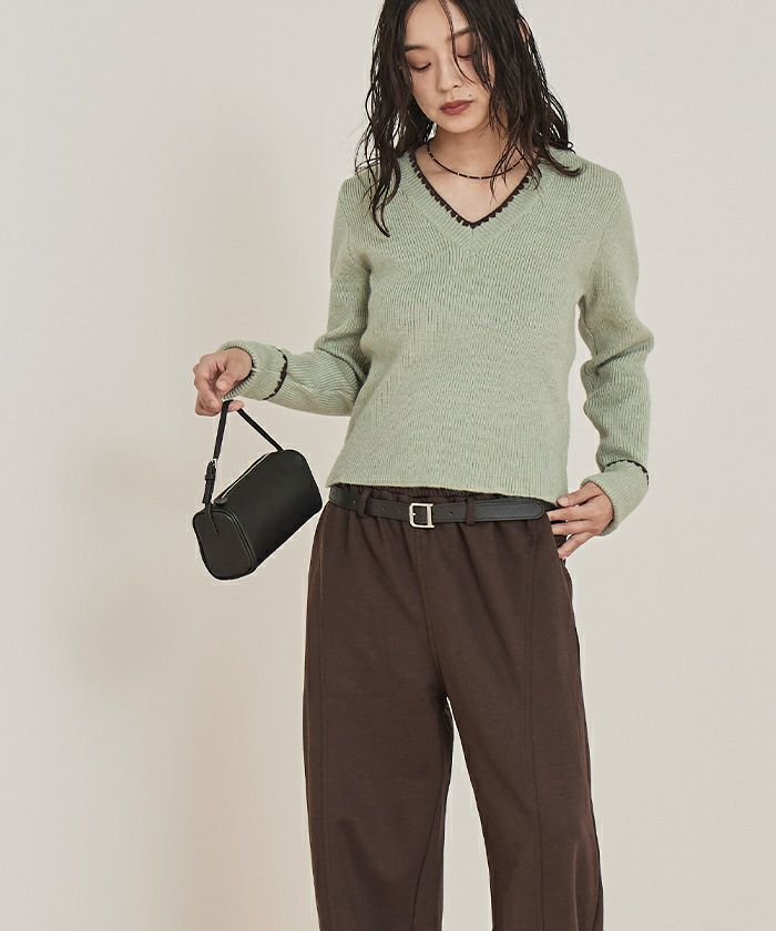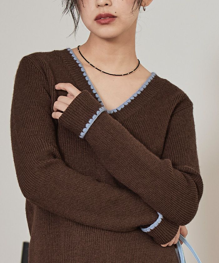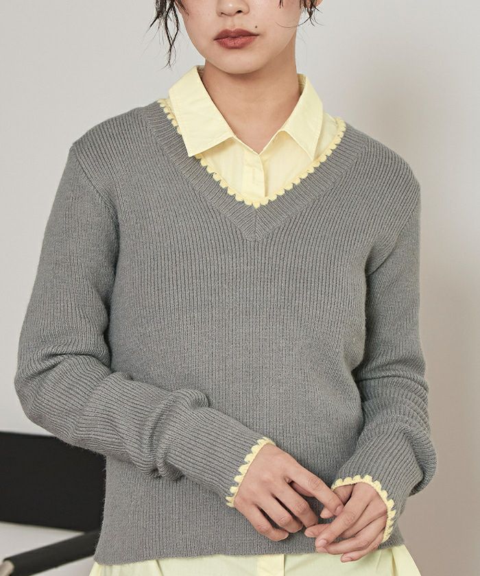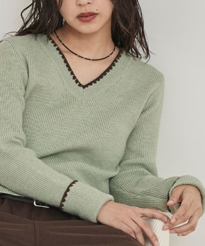 ・リメイク風の配色ステッチが映えるVネックロールアップニット