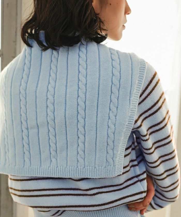 ・配色のマルチボーダーとケーブル編みニットショールのセット商品