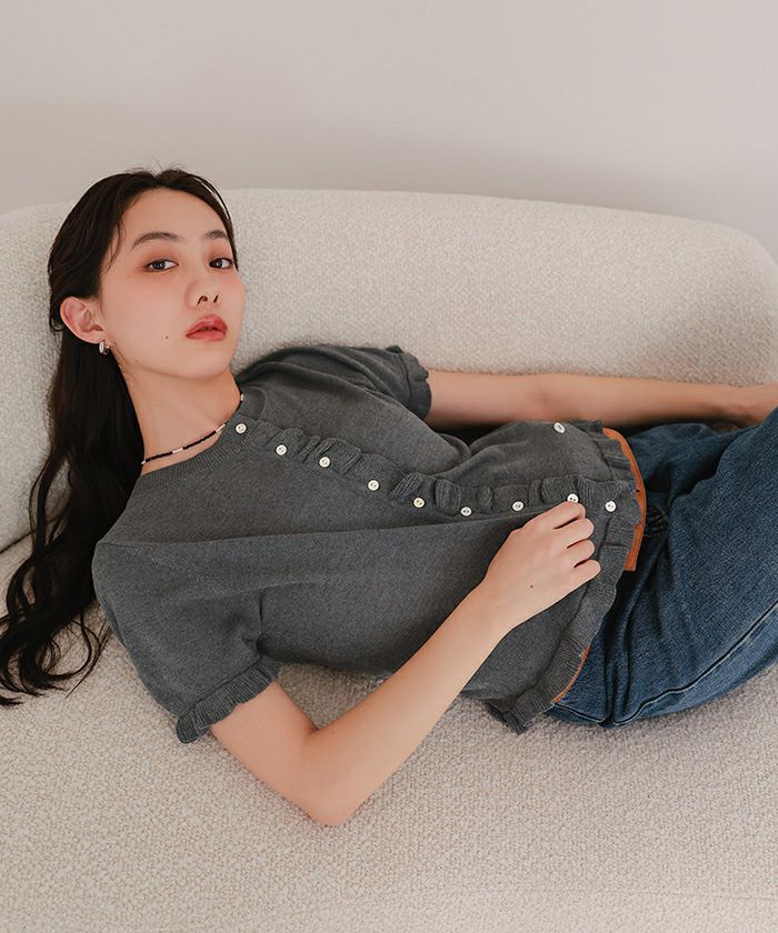 ・袖口と裾のフリルが女性らしさを引き立て、左裾のチャームがさりげないアクセントに