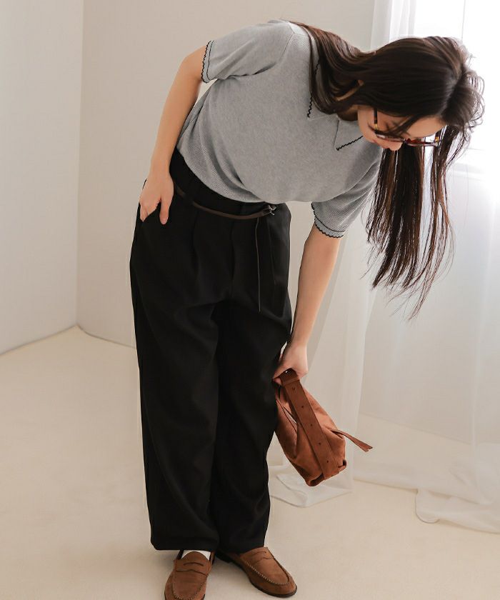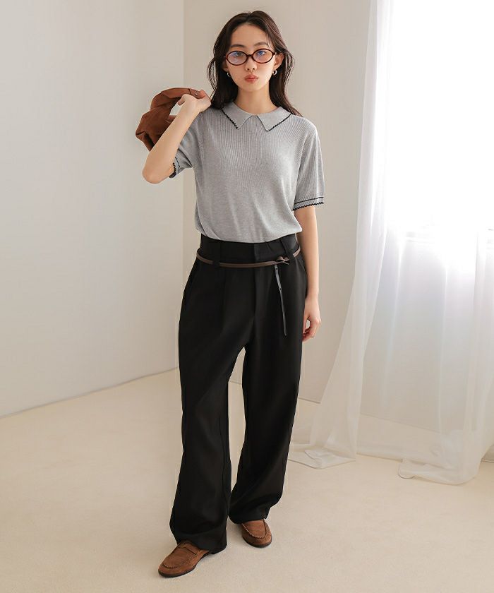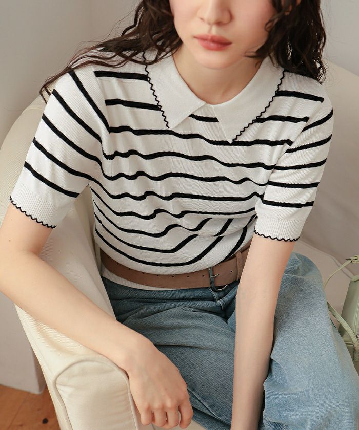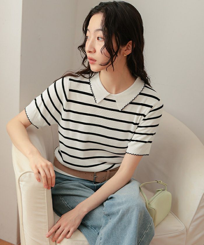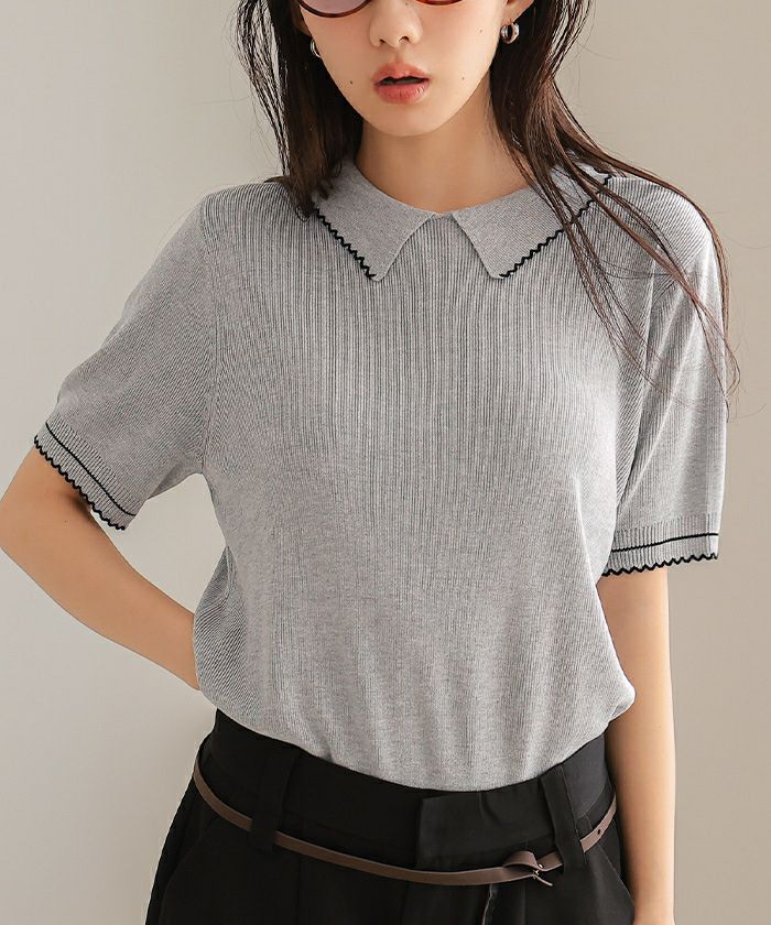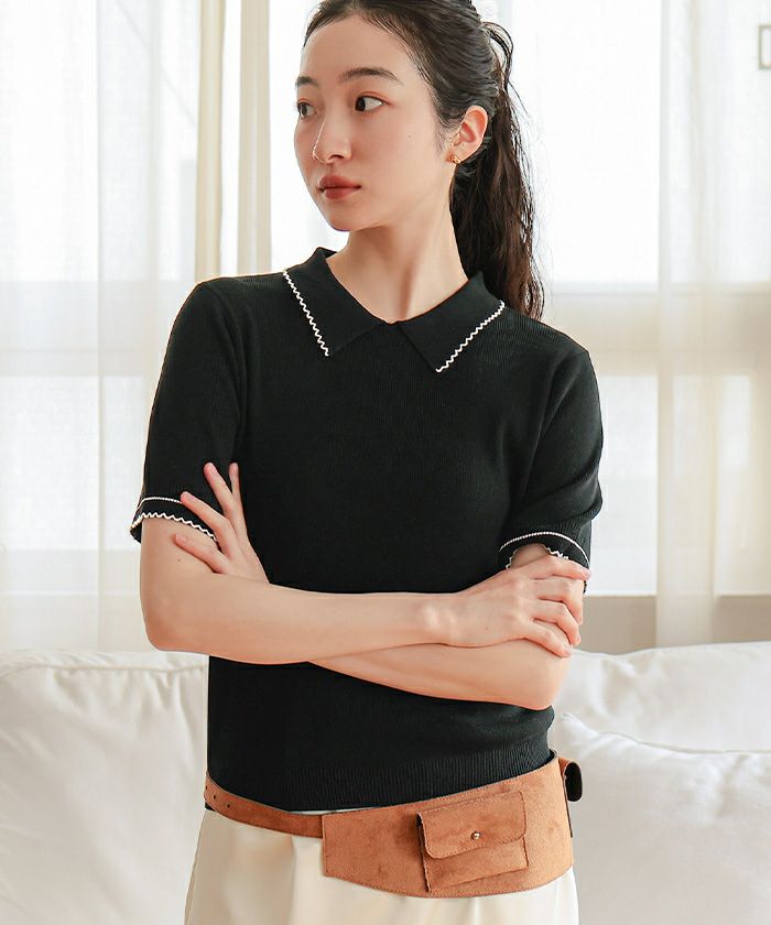 ・襟元と袖口に施したピコデザインがポイントの半袖ポロニット